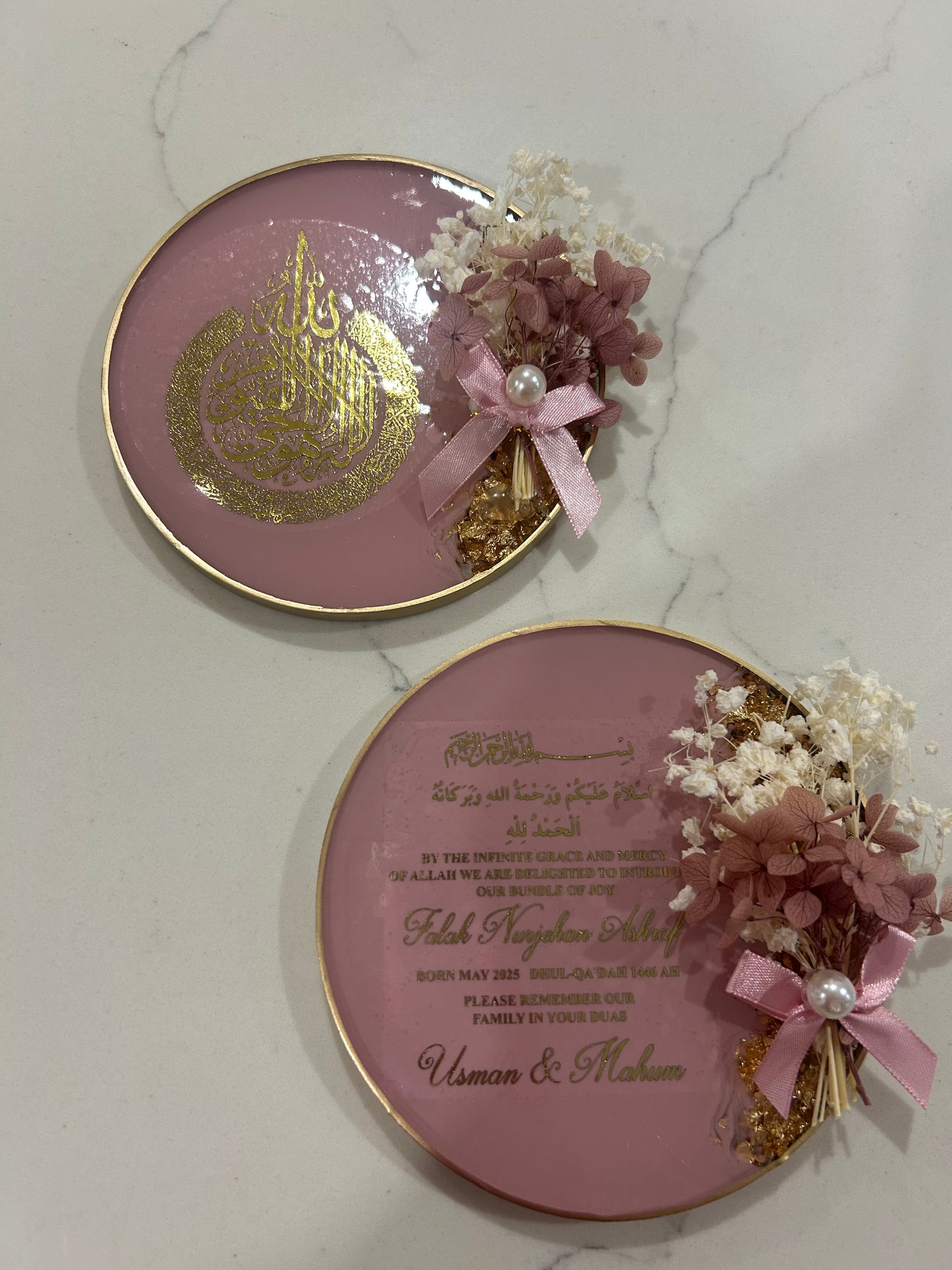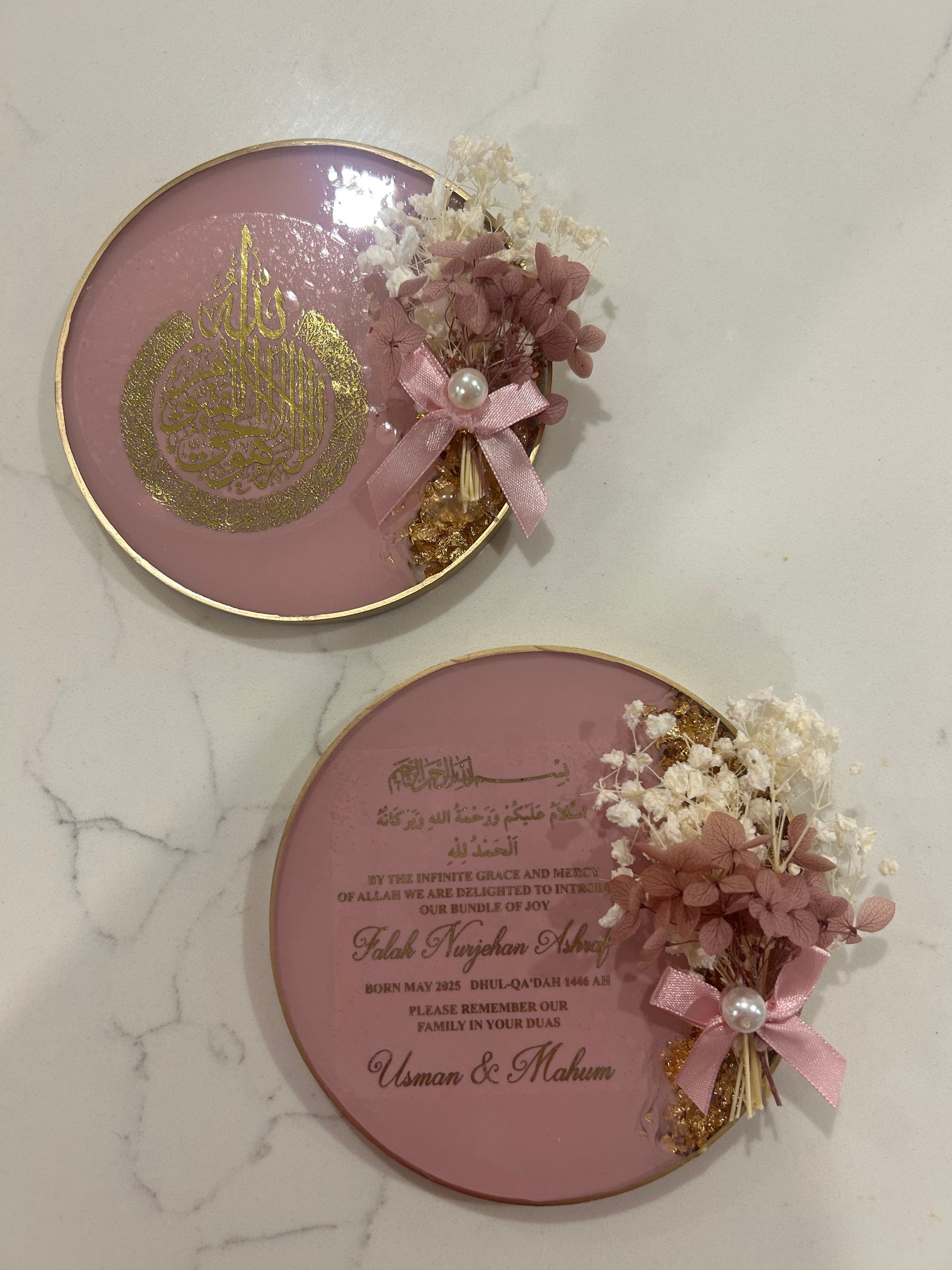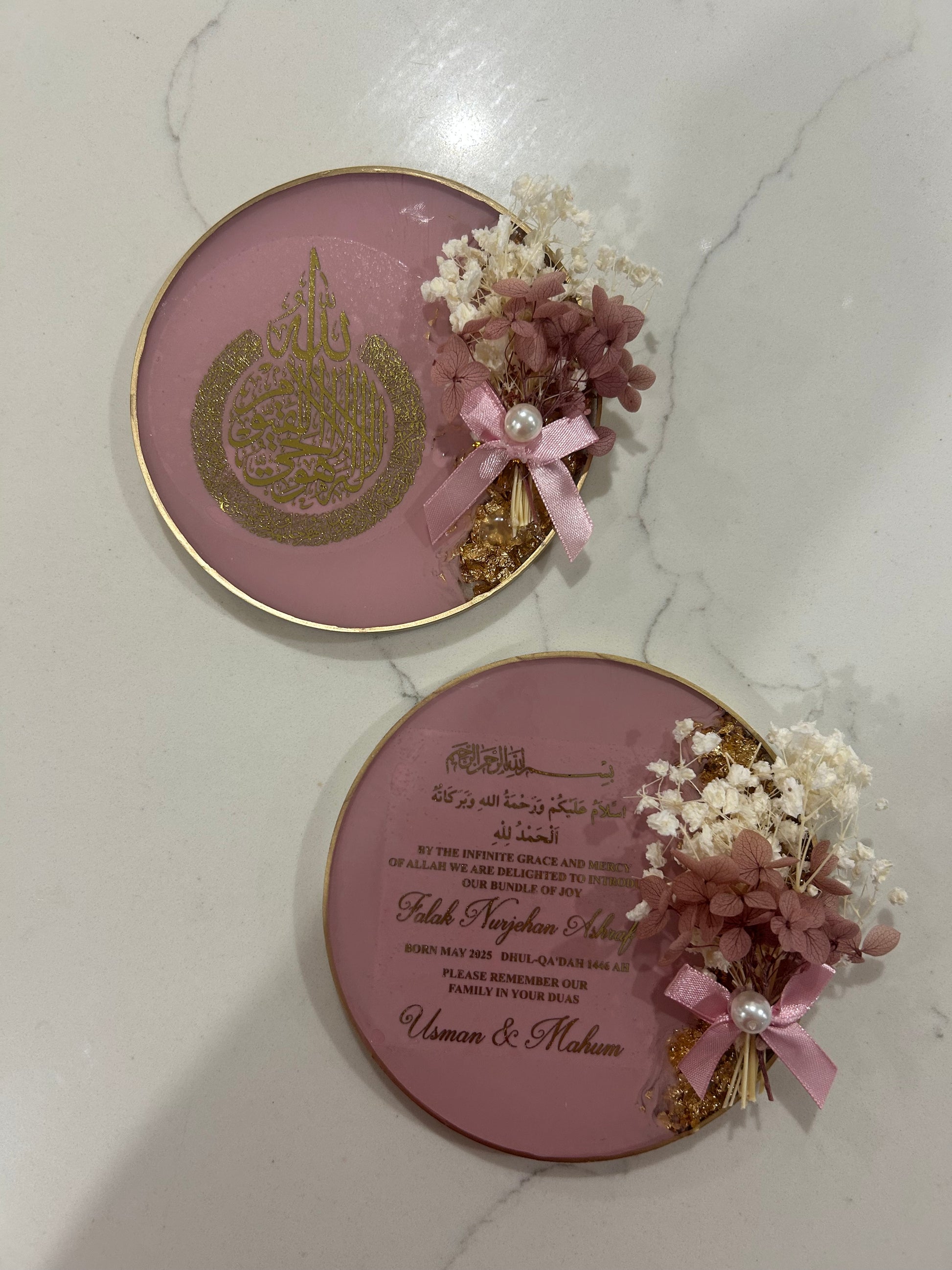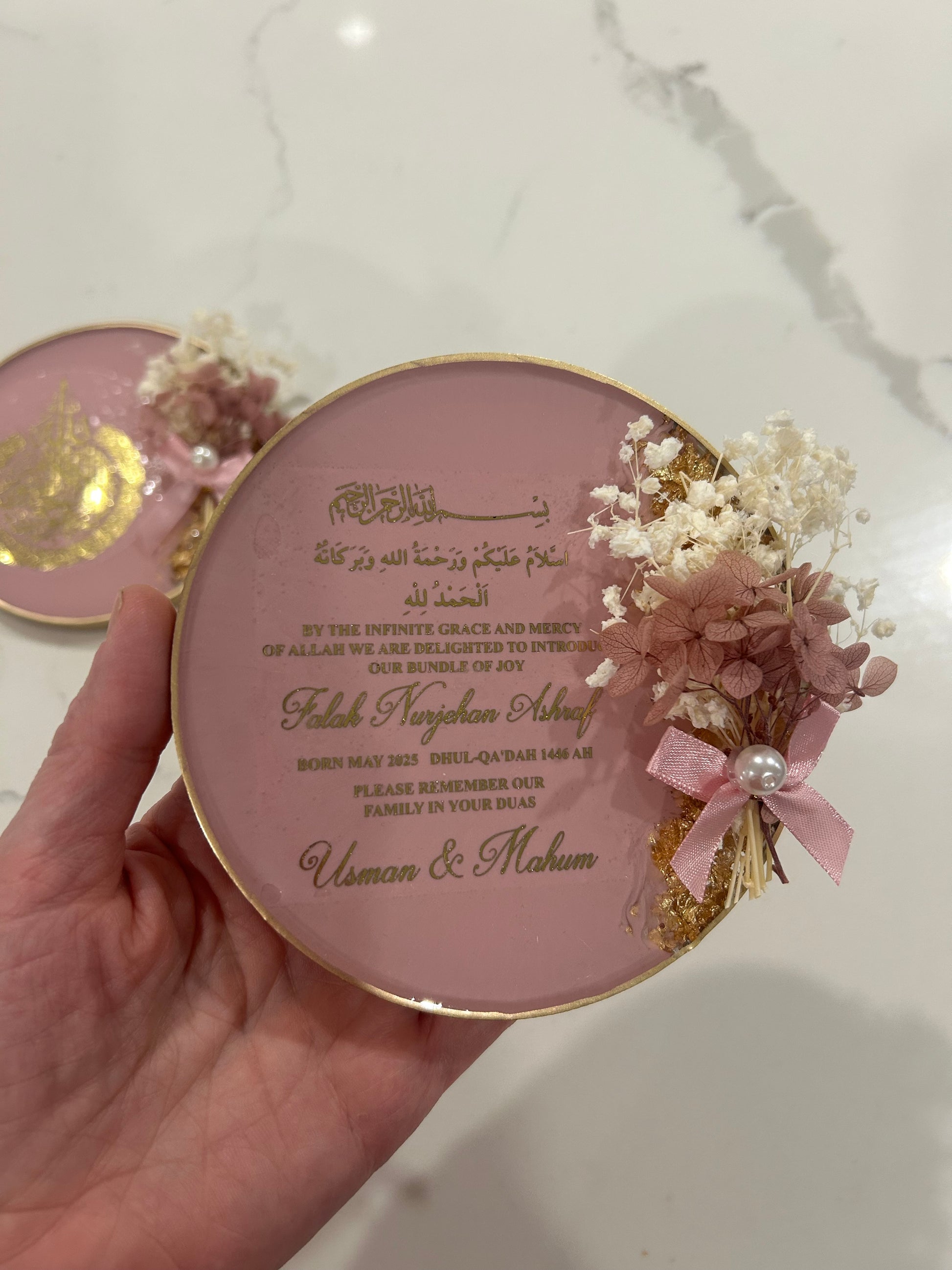 Baby announcement coaster I made for the customer who celebrate newborn decorate with flower and doa as well .pink coasters for the girls you can choose the colour and name message now 0403 731 807.