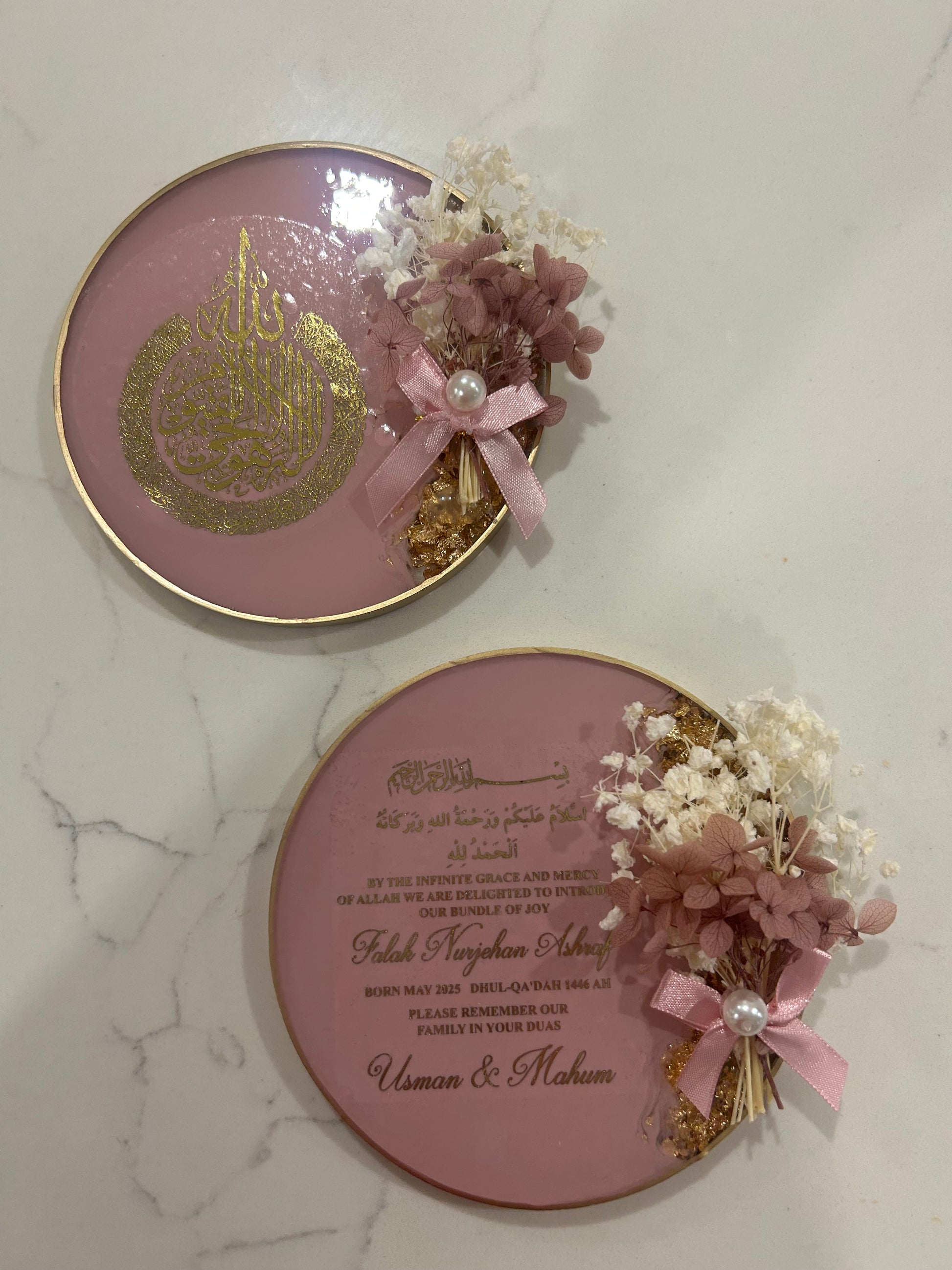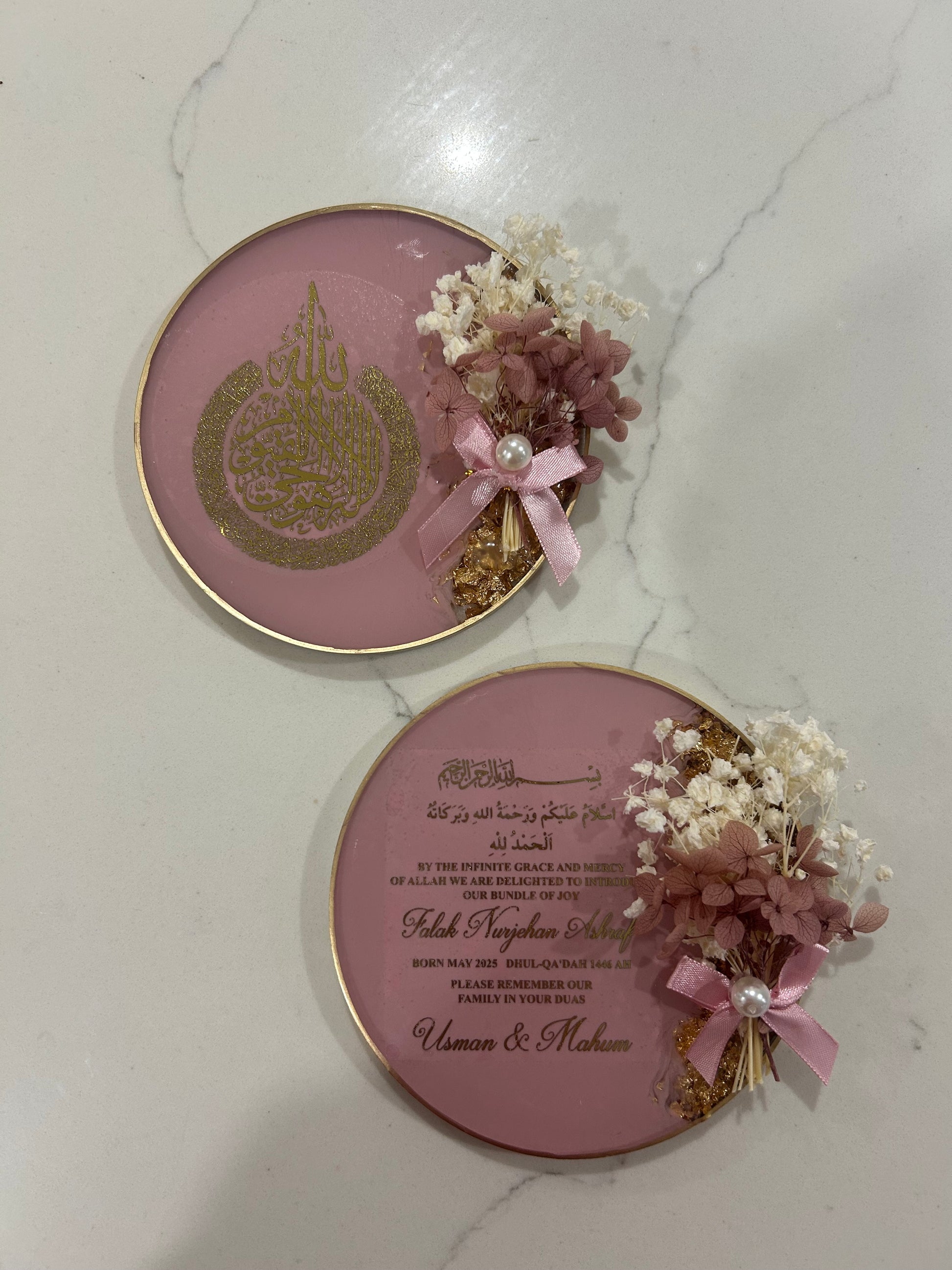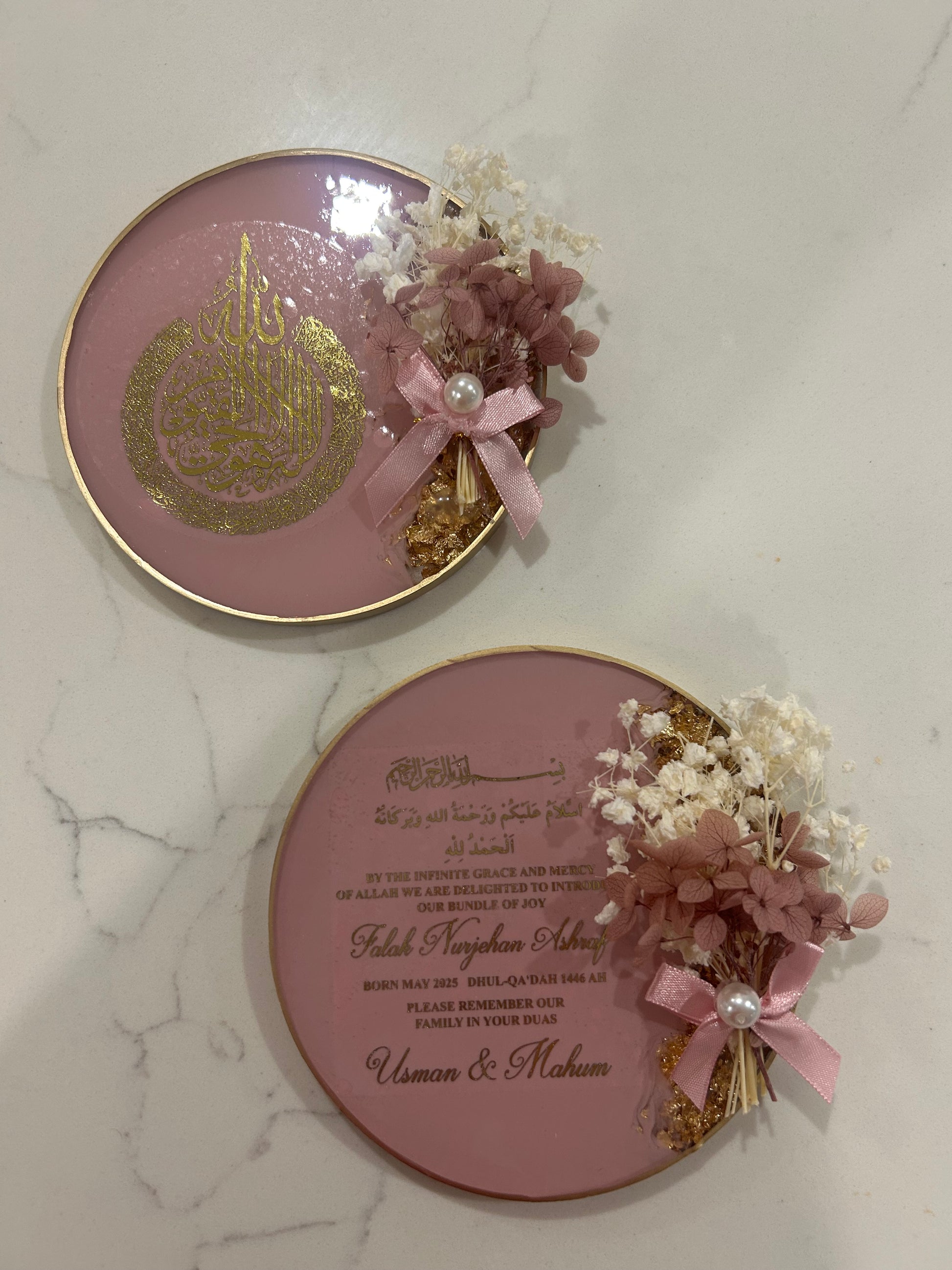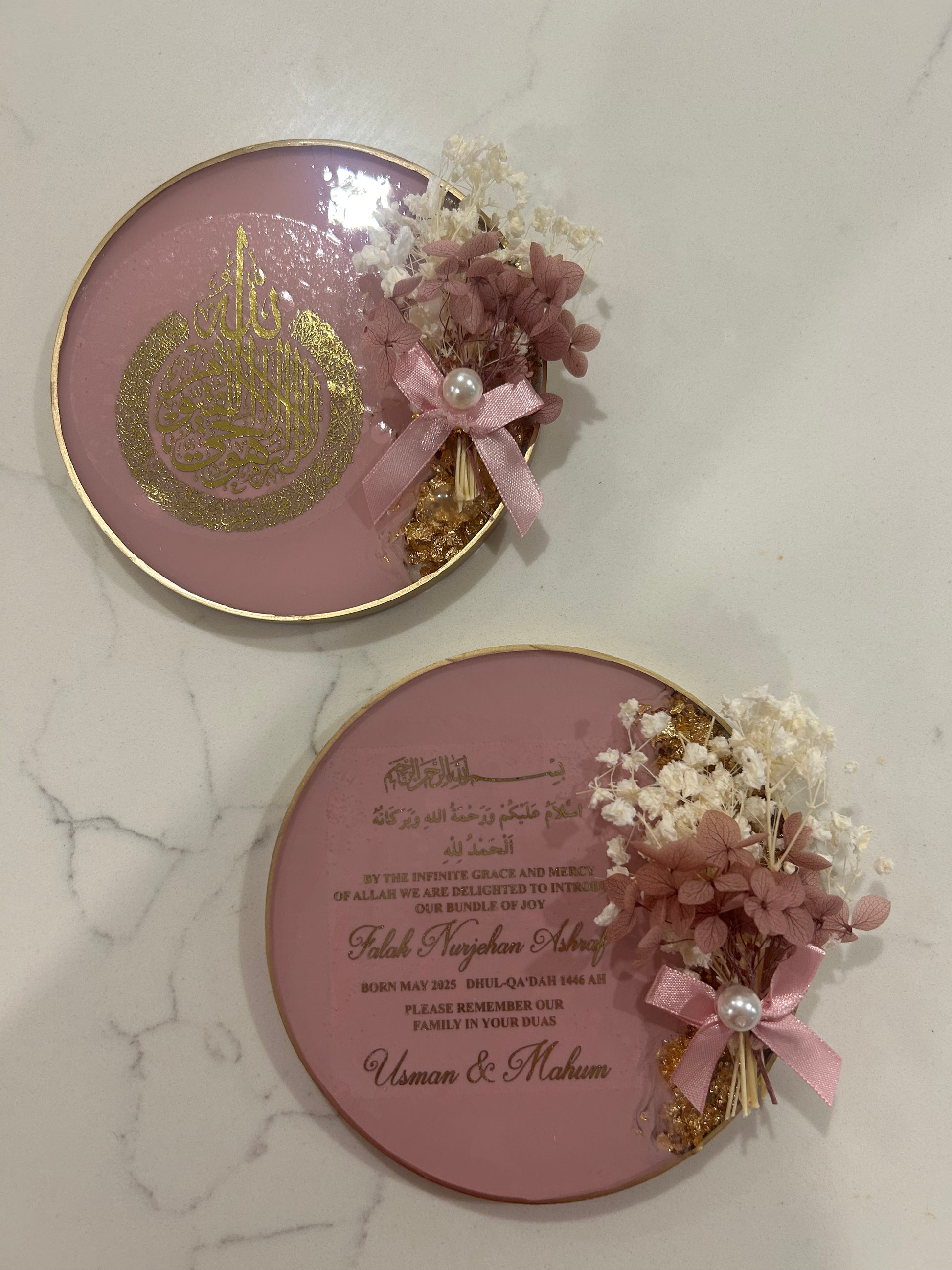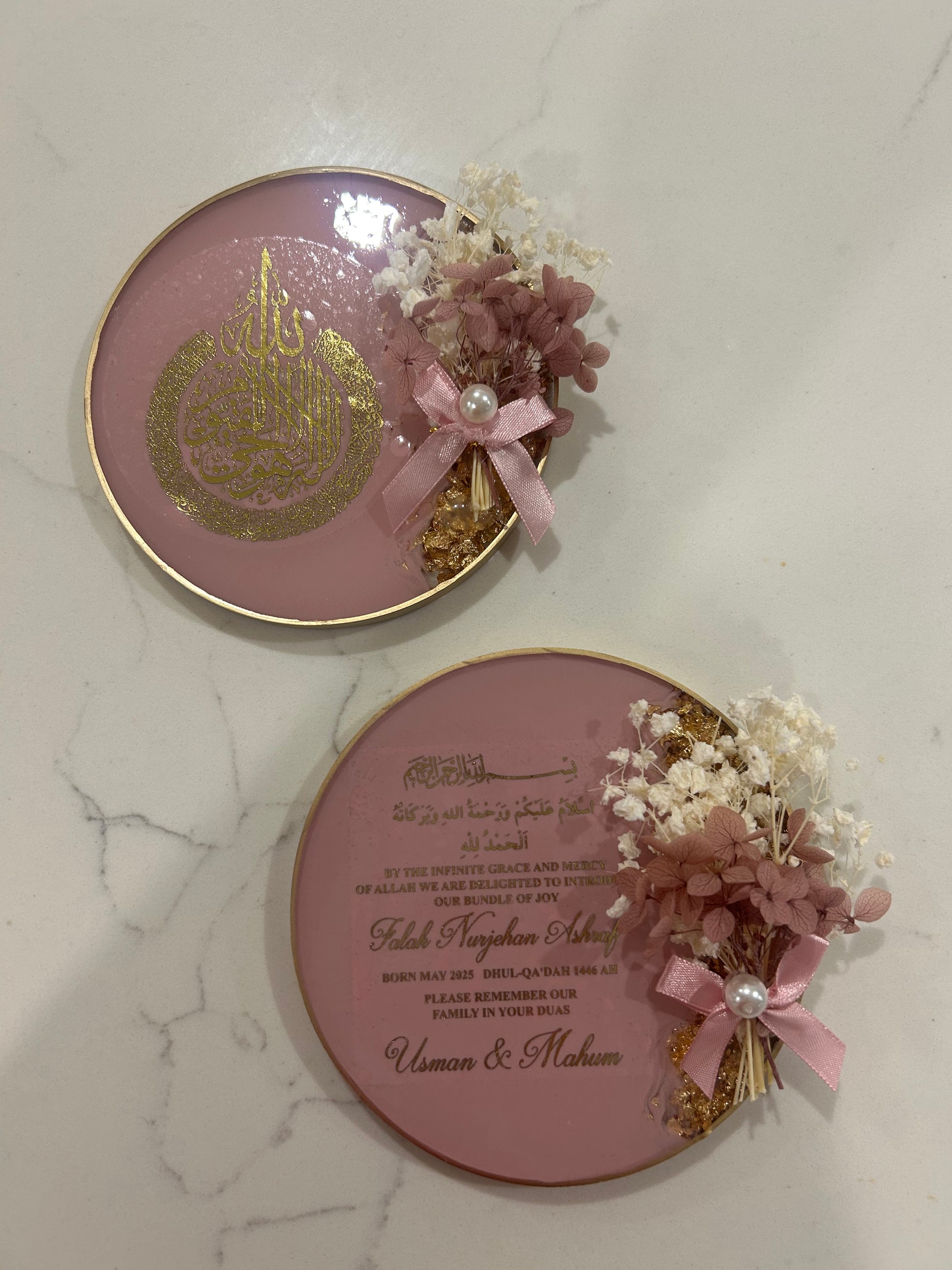 Baby announcement coaster I made for the customer who celebrate newborn decorate with flower and doa as well .pink coasters for the girls you can choose the colour and name message now 0403 731 807.
