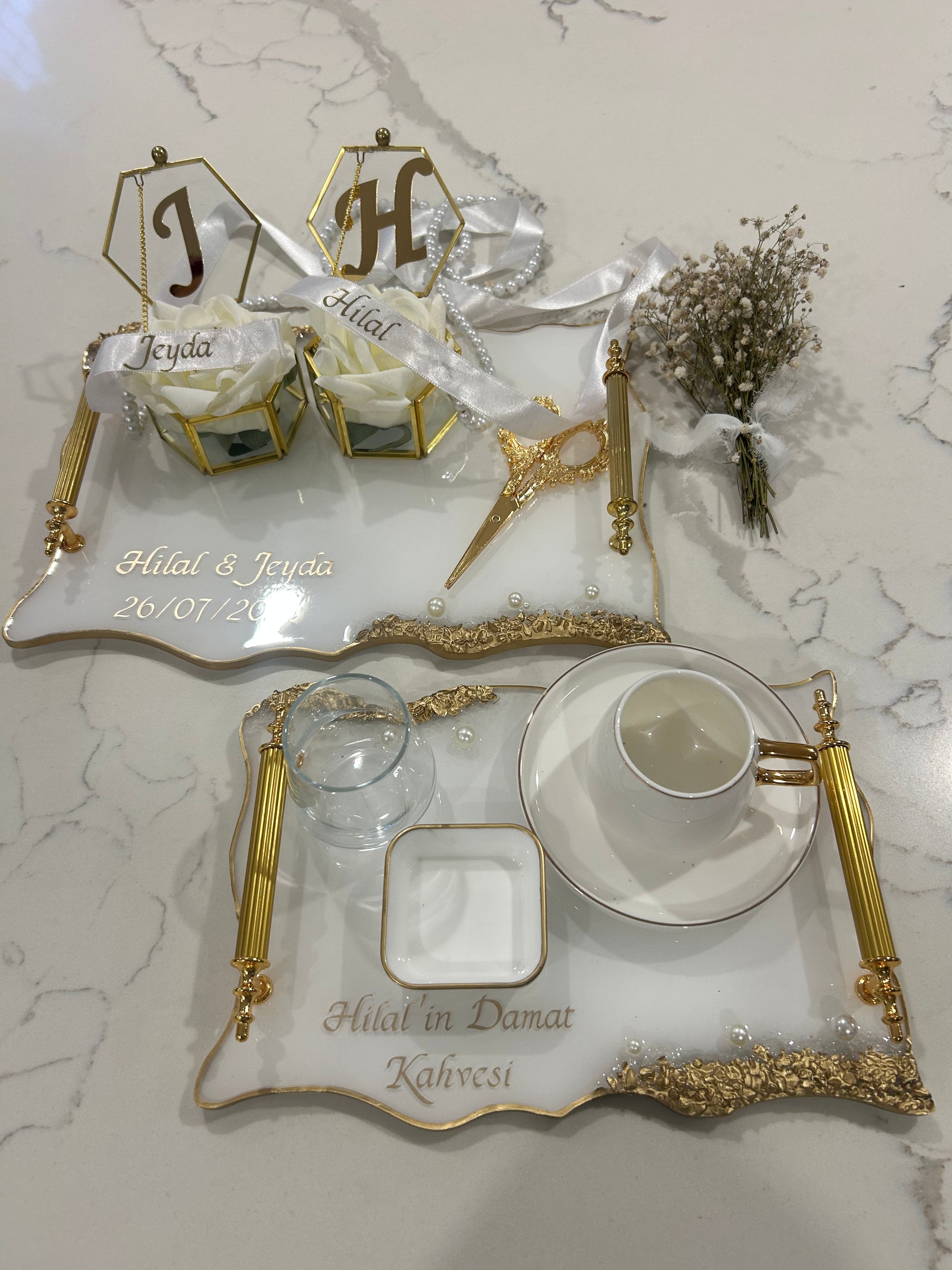 The lower tray is the traditional damat kahvesi (groom’s coffee tray), featuring: