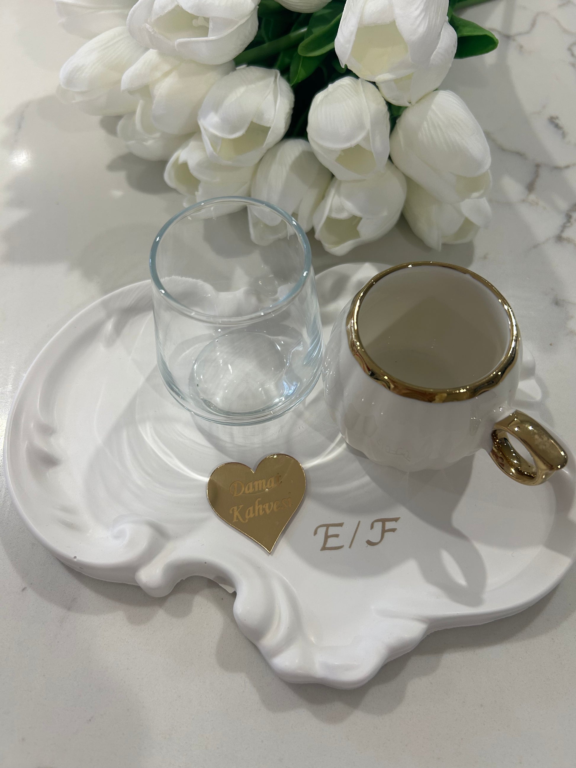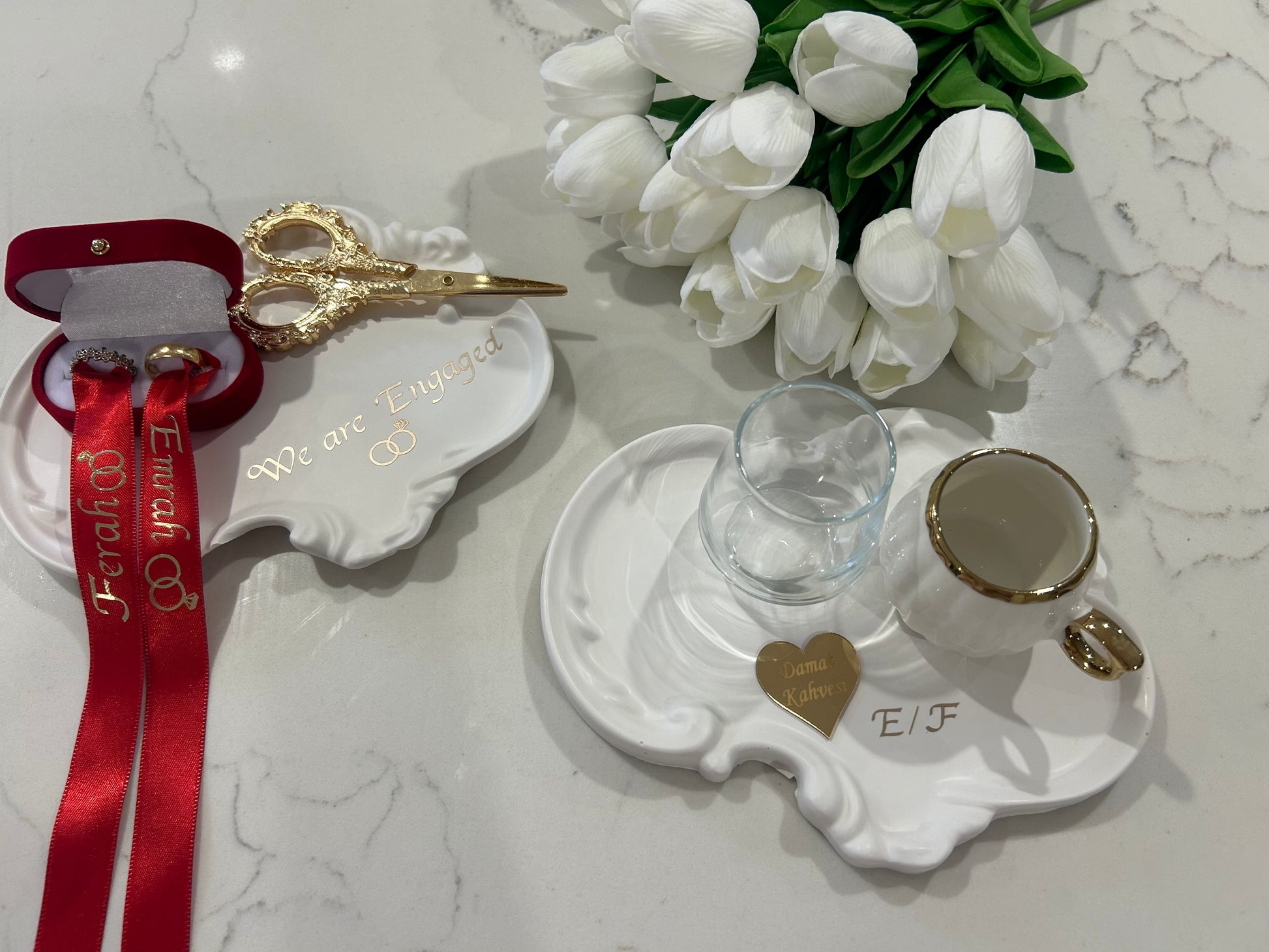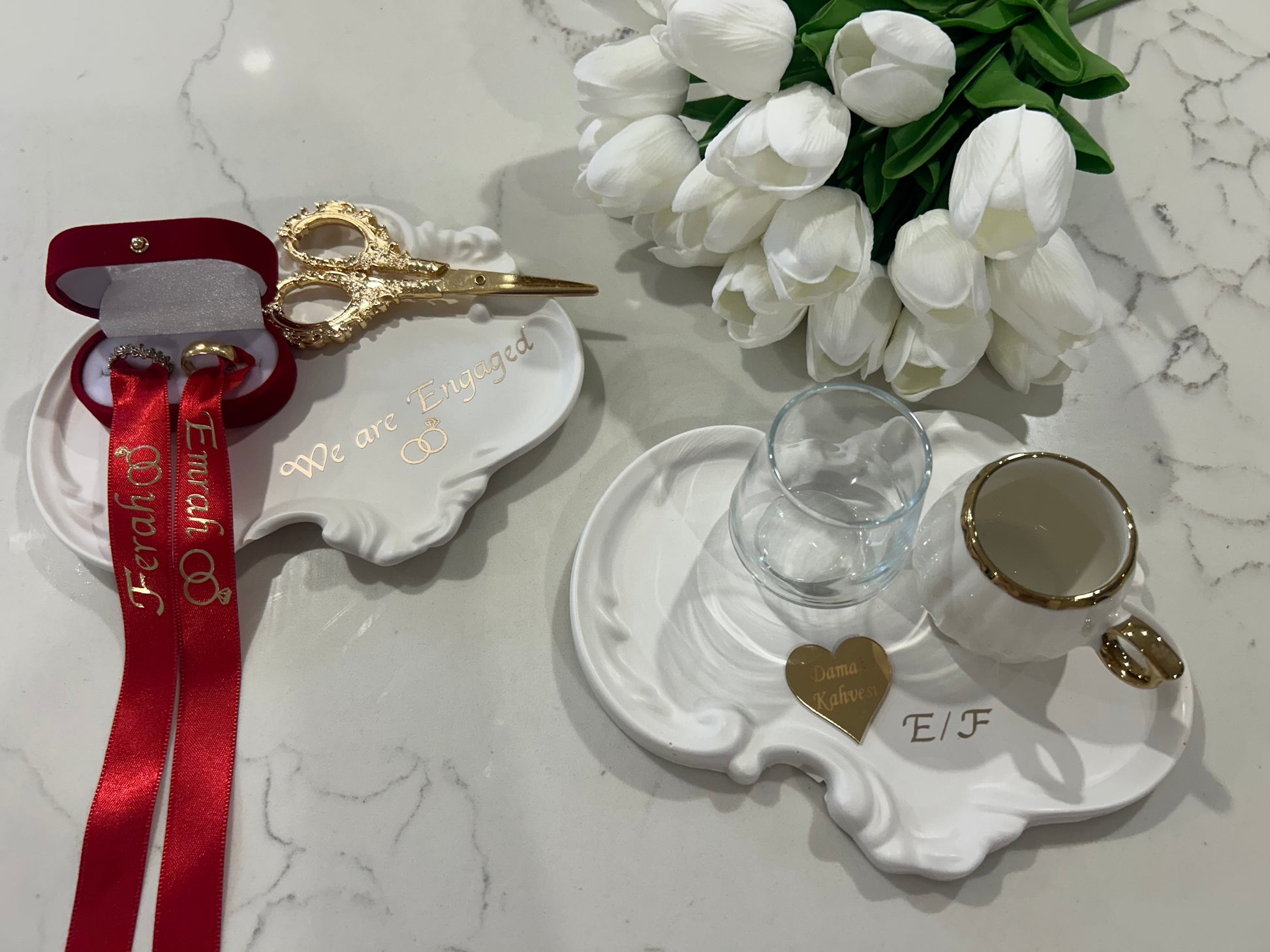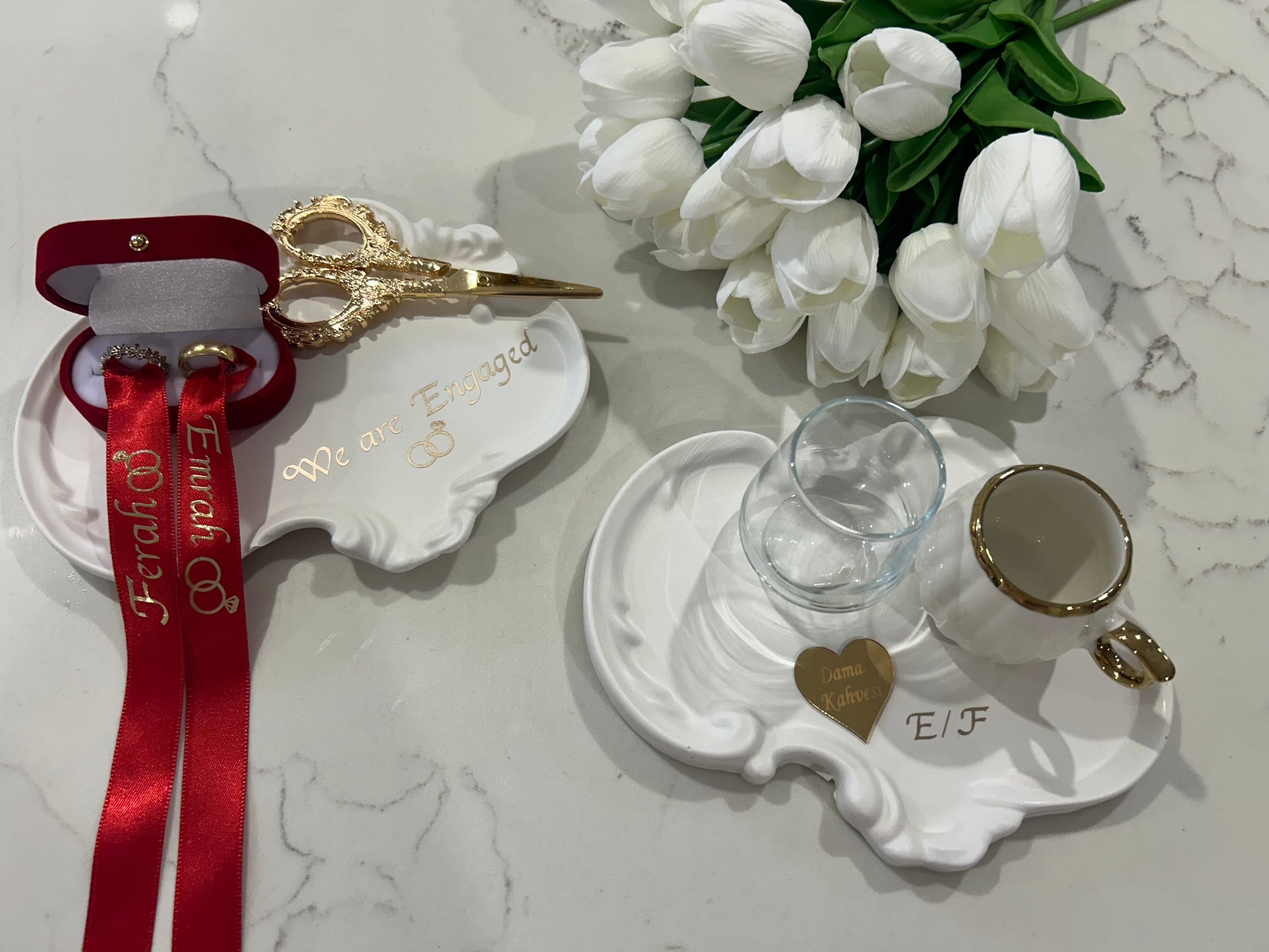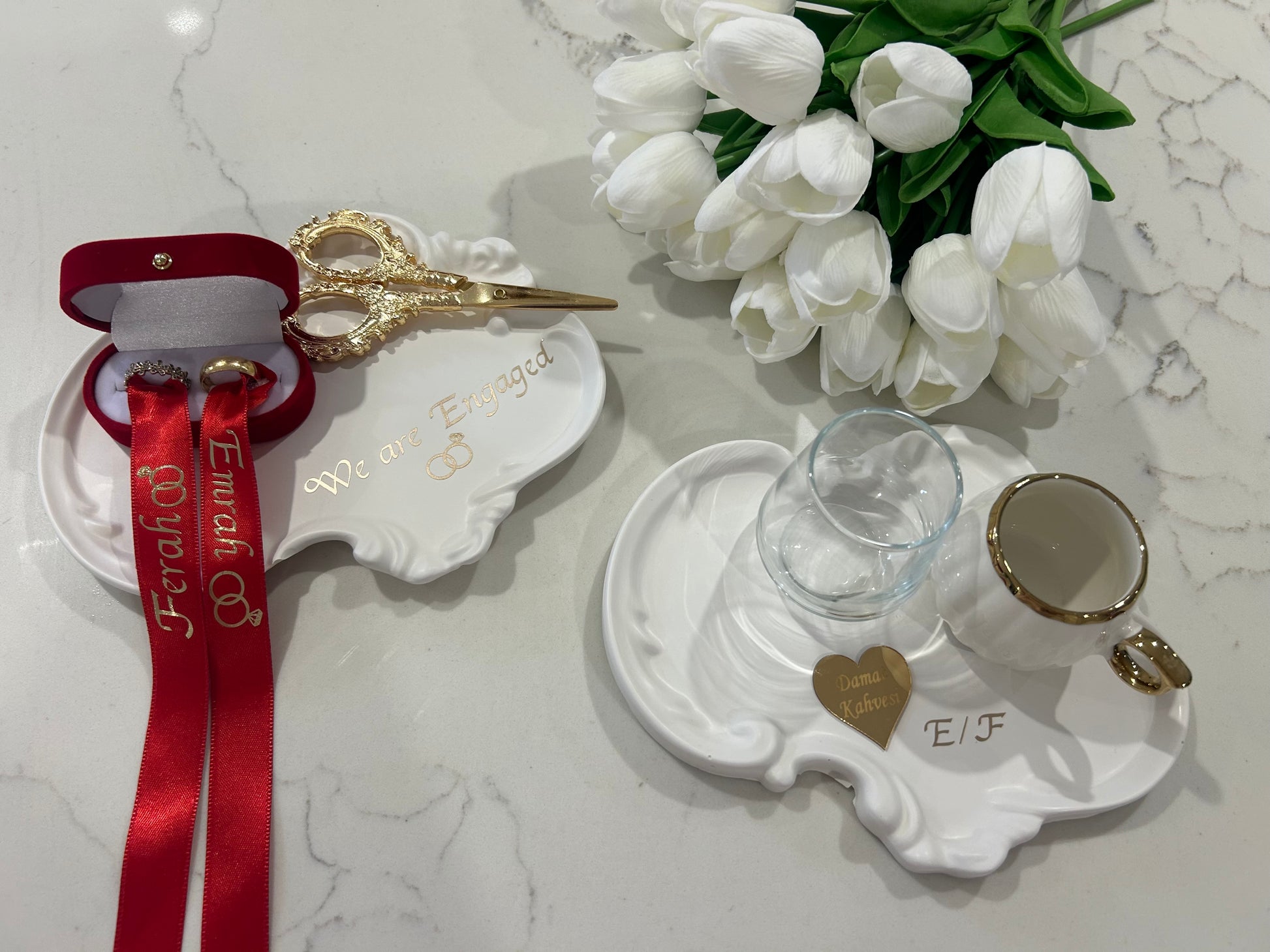Have a look at the photos I made engagement plates and cofee plates and personalise as well everything comes in the set yu see at the pictures you can message now for personalise for your event.0403 731 807
