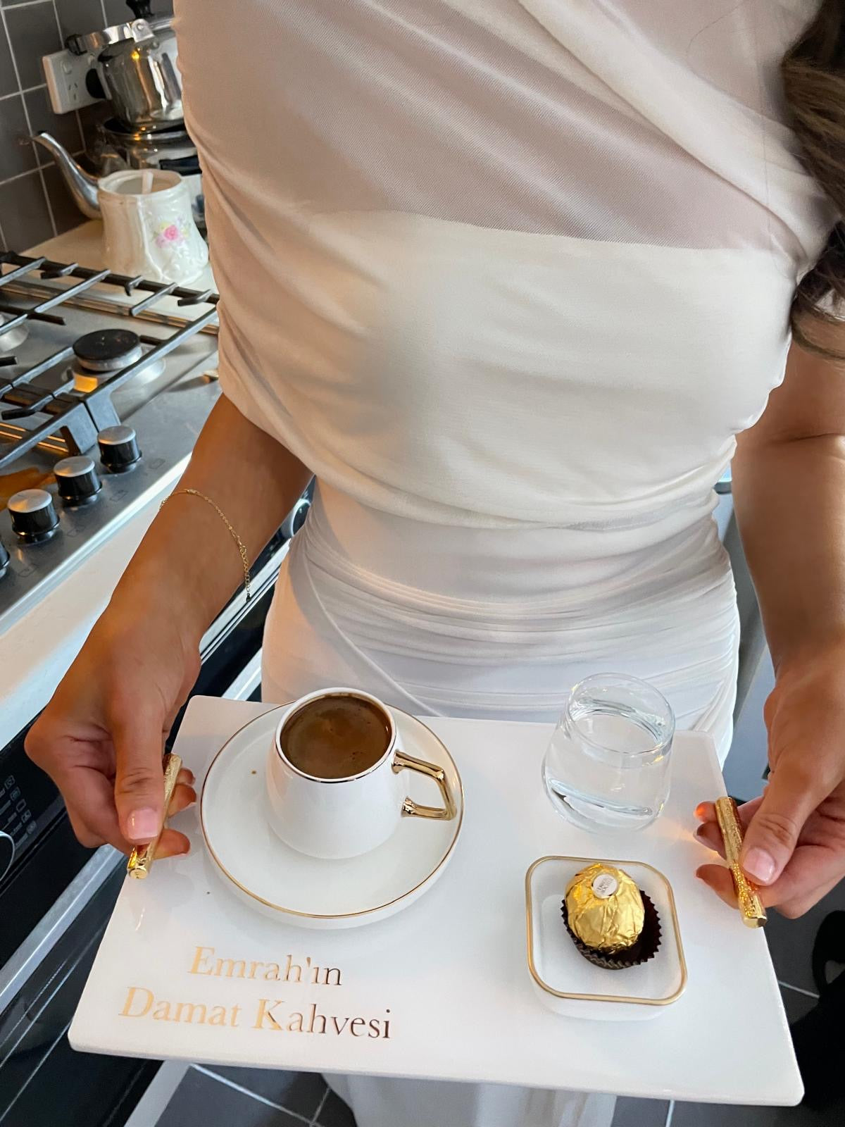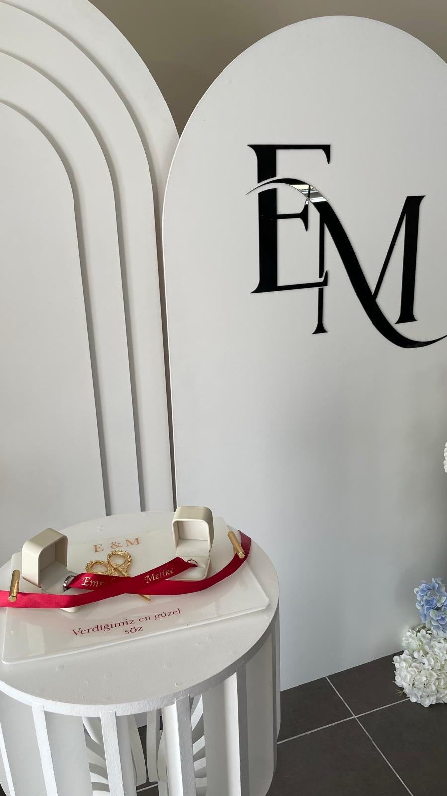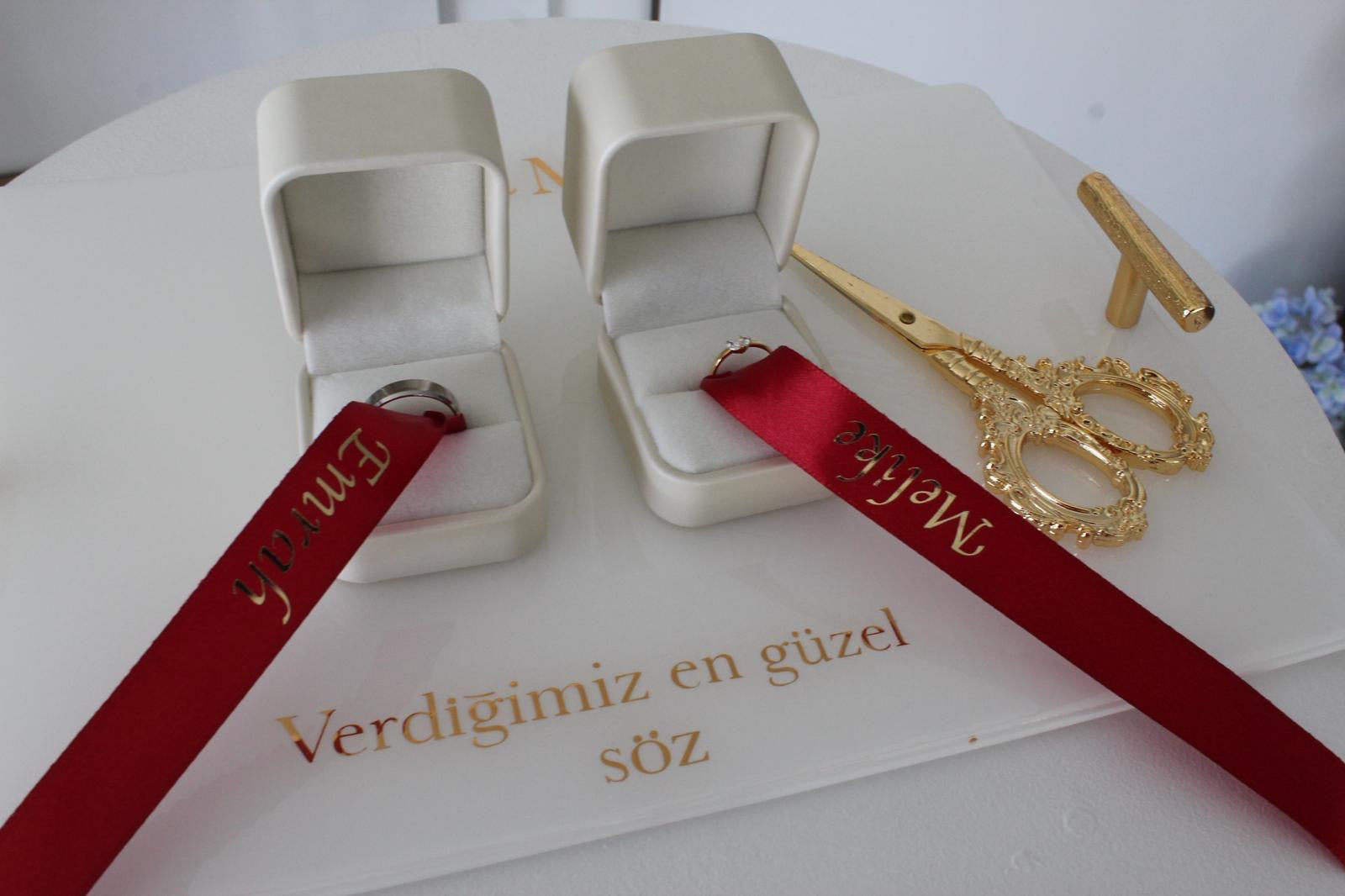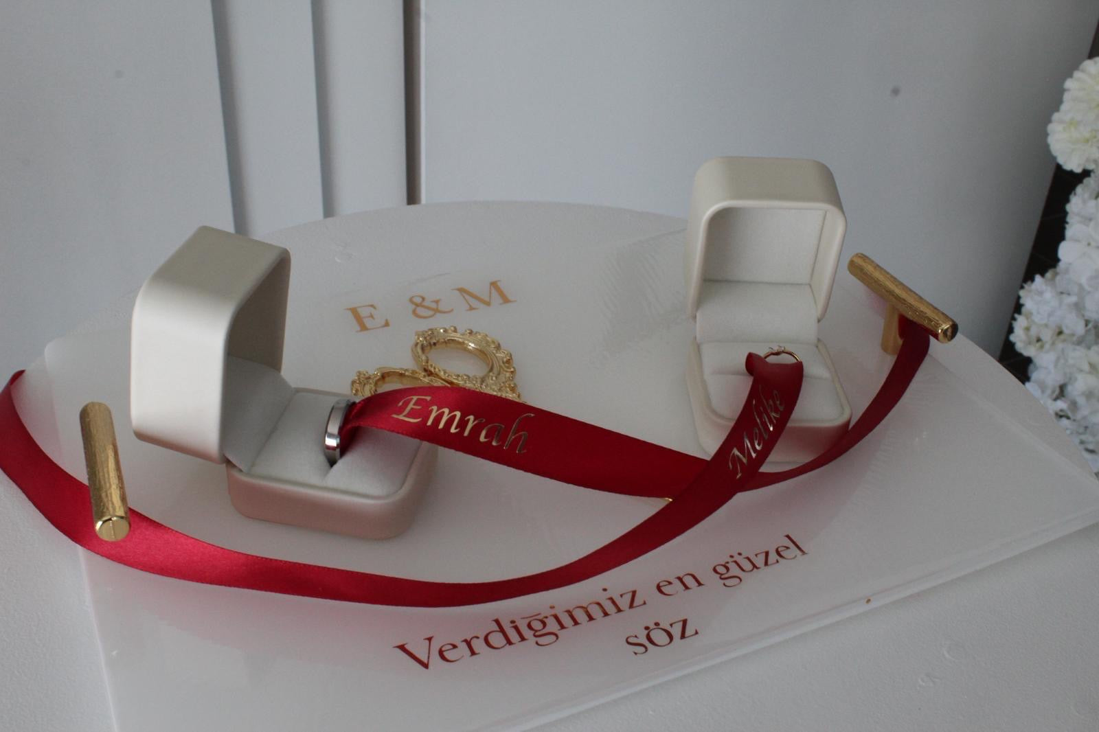 I have created an elegant engagement/wedding ring presentation set. The cream ring boxes, the deep red ribbon personalized with names (“Emrah” and “Melek”), and the golden scissors all look so classy together. The floral background and the engraved acrylic base with writing add an extra touch of sophistication.You made a personalized “Damat Kahvesi” (groom’s coffee) serving tray. The white tray with gold lettering “Emrah’ın Damat Kahvesi” looks so elegant, and the matching gold-detailed coffee cup, water glass, and Ferrero Rocher chocolate make it perfect for a traditional engagement/coffee ceremony. The little golden handles on the tray give it a very luxurious touch. Message now ıf you lıke to order yours today 0403 731 807