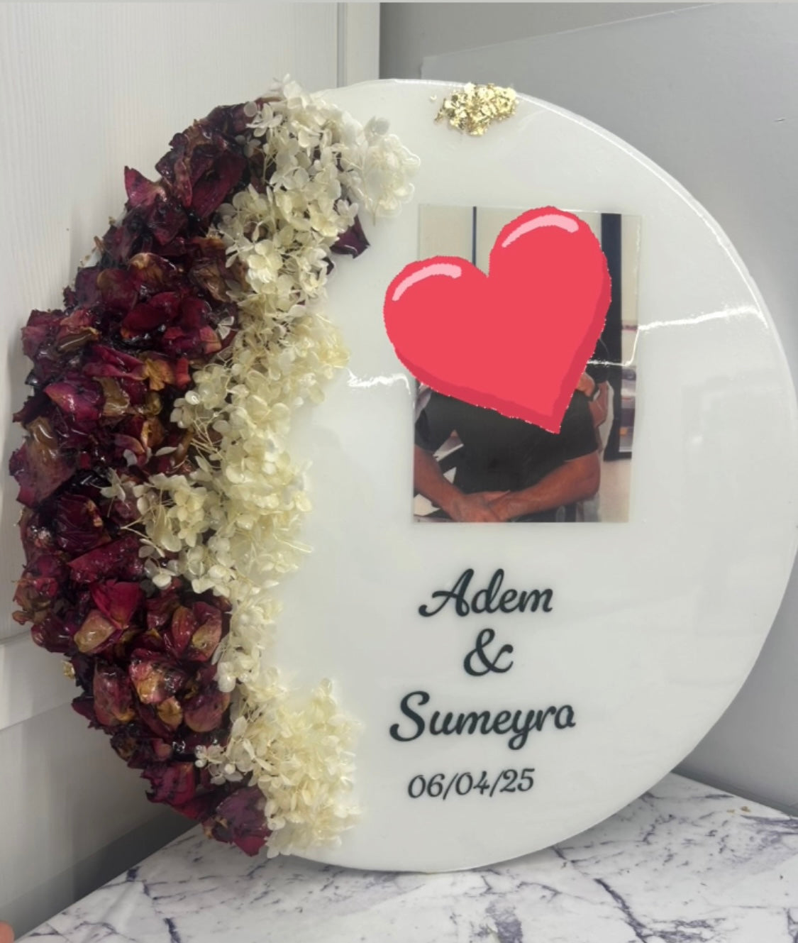 I made and design this beatiful engagement sign for the couples who getting engage and for display at their table for their special day its a round engagement resin board used a real dry roses and white flowers for decorate message now and order if you like to order yours today. 0403 731 807