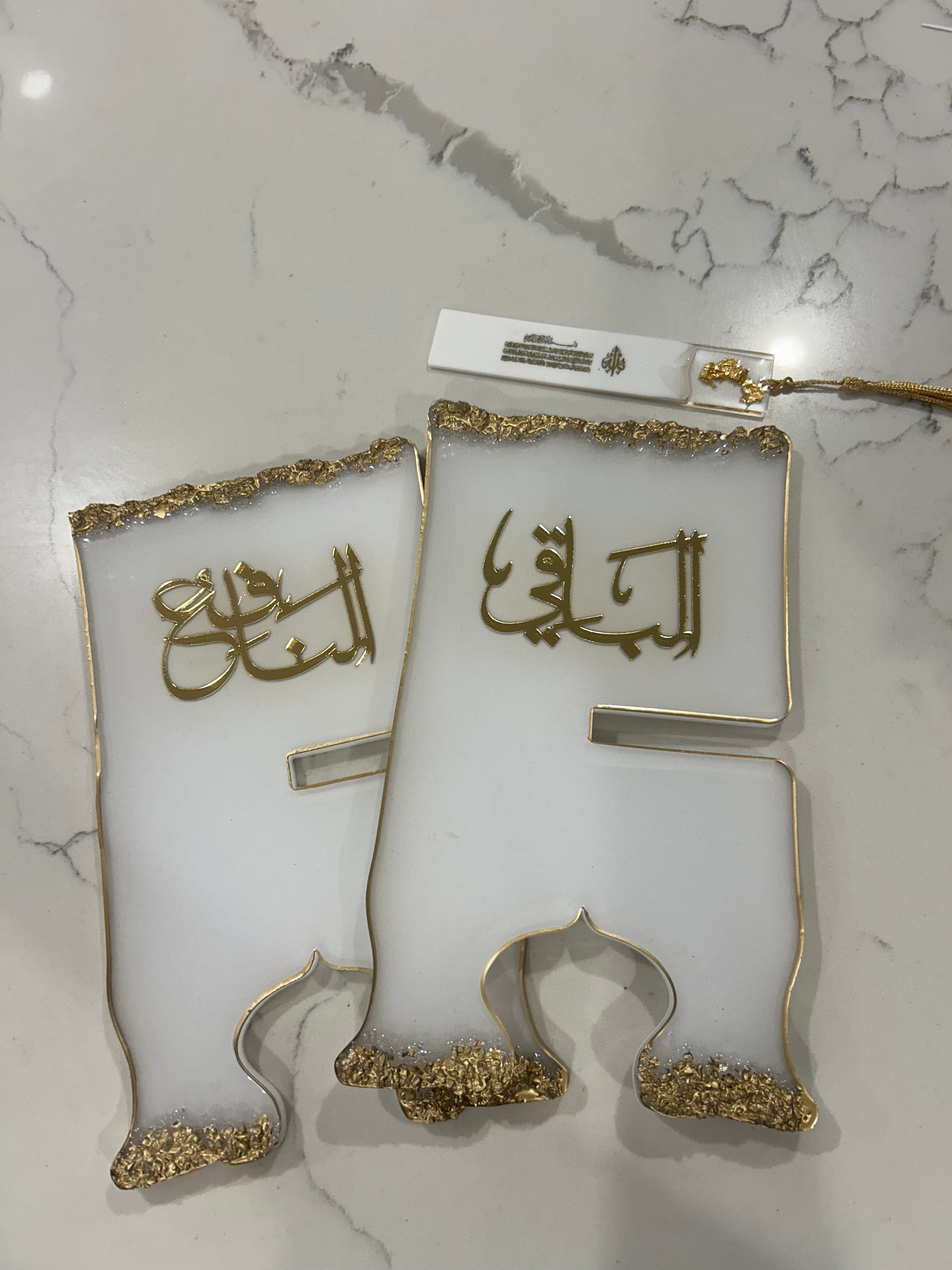 A beautifully handcrafted resin Qur’an display, shaped like an open book and designed with a graceful blend of white and gold. The pages are adorned with intricate golden Arabic calligraphy, while the edges are delicately embellished with shimmering gold accents for a luxurious finish. A timeless piece that radiates elegance and reverence, perfect for honouring the beauty of the Qur’an in any home. Message now if you like to order 0403 731 807