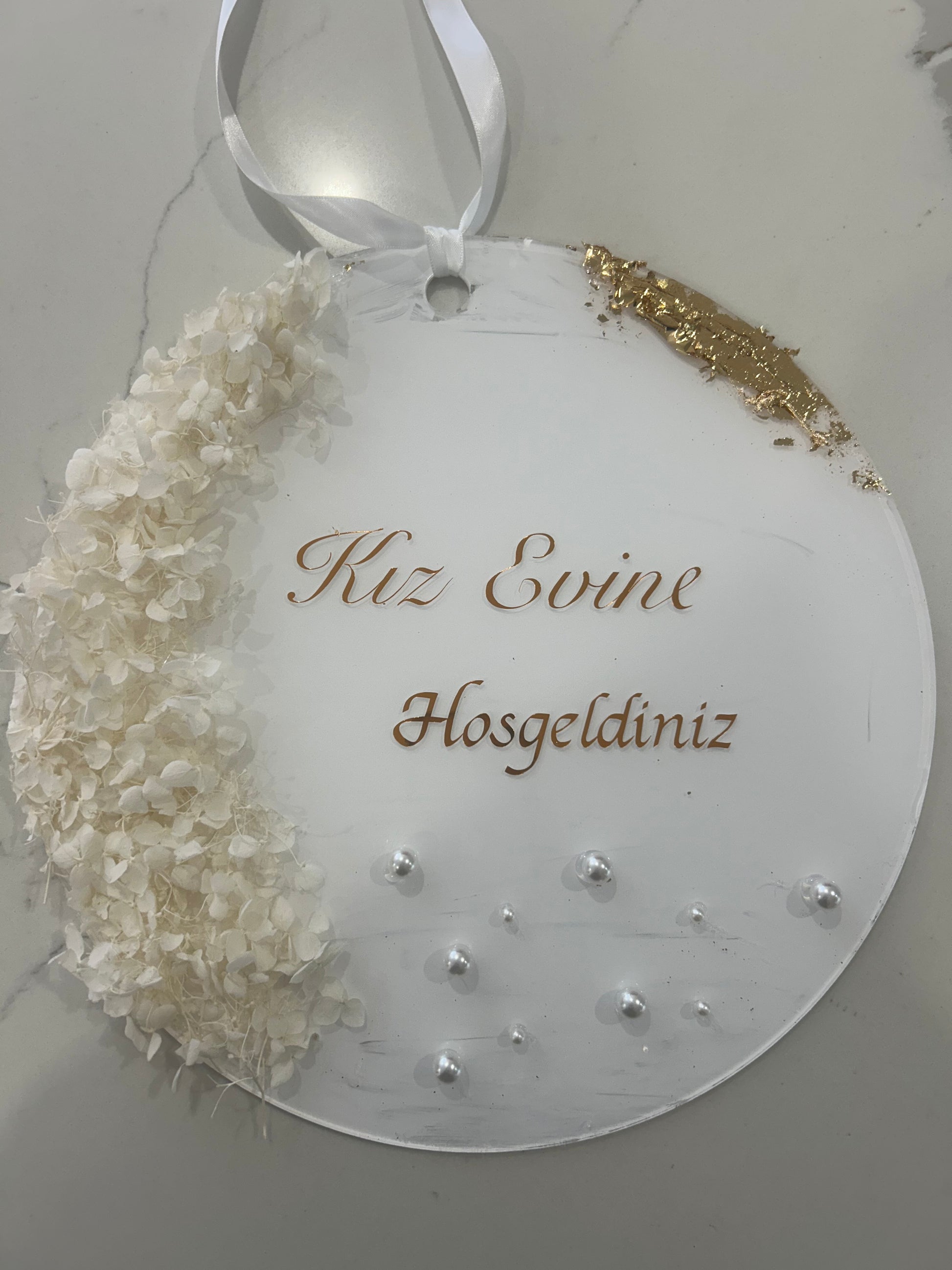 A graceful handmade resin welcome plaque, designed with delicate preserved florals, soft pearl accents, and a touch of shimmering gold. Perfectly crafted to greet guests with elegance and warmth, this timeless piece is ideal for special occasions such as engagements, henna nights, and weddings.” Message now ıf you like to order for thıs beatıful handmade elegant sign