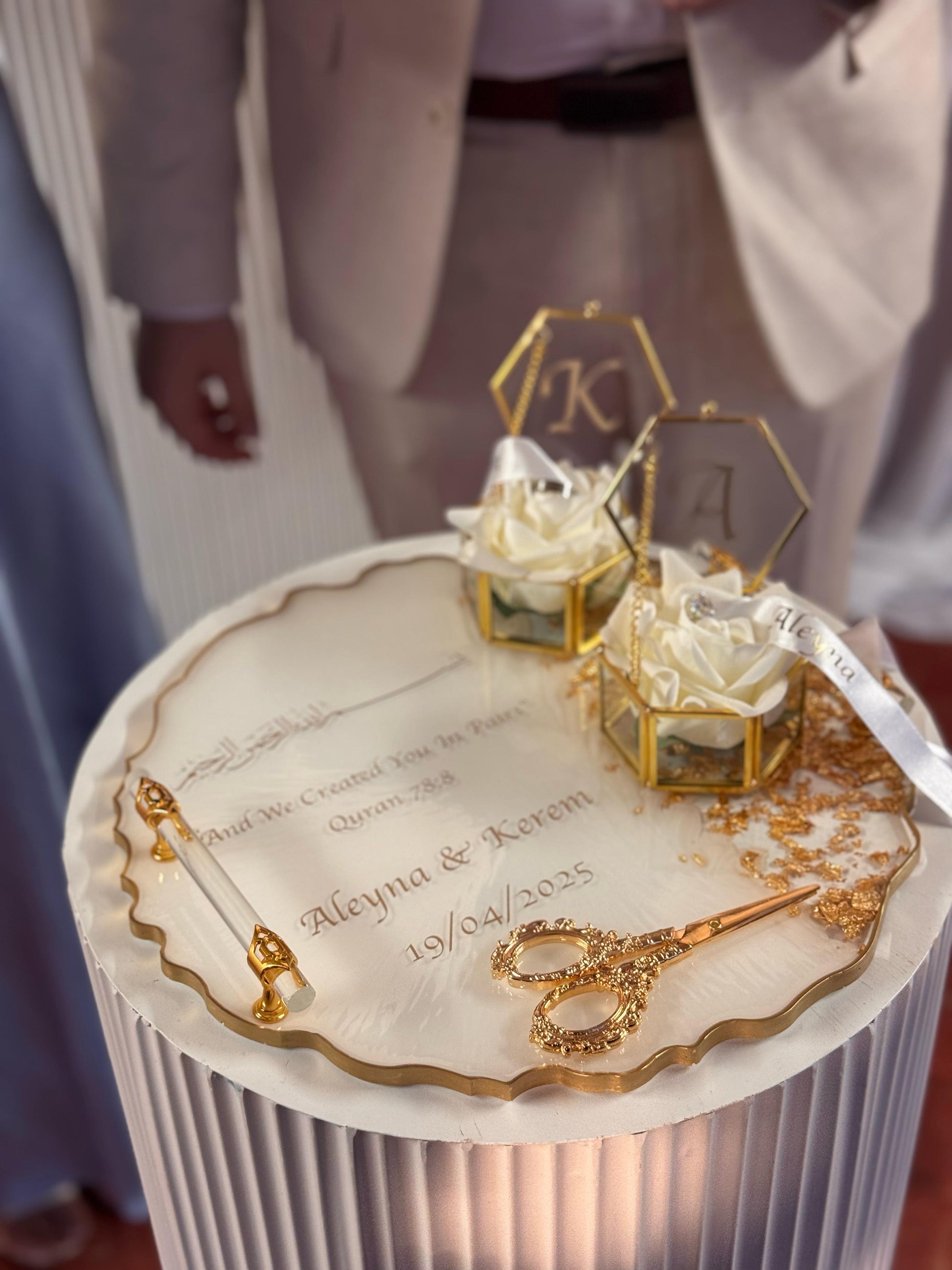 Congratulations Aleyna and Kerem check the engagement tray with golden scissors and roses comes In the set everything yu see at the picture message now if yu like to order yours 0403 731 807
