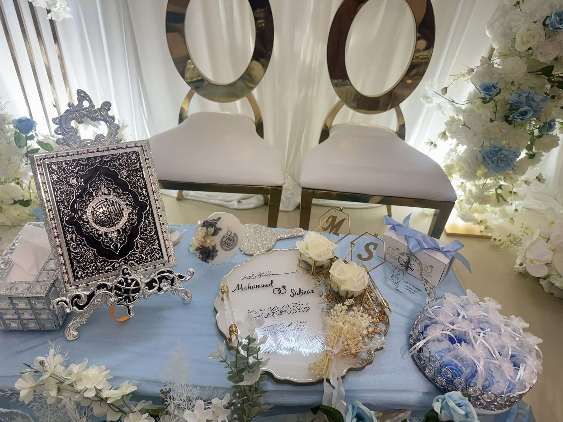 I designed this elegant engagement tray for Safinaz and Muhammad’s special day. The setup features preserved flowers, a personalized nameplate, and delicate resin art. Every piece, including the customized Quran display and favor boxes, was handmade with love. Soft blue and white tones, with floral touches, bring a serene and classy look to the celebration. May their journey be blessed with joy and harmony. Message now ıf you lıke to order 0403 731 807