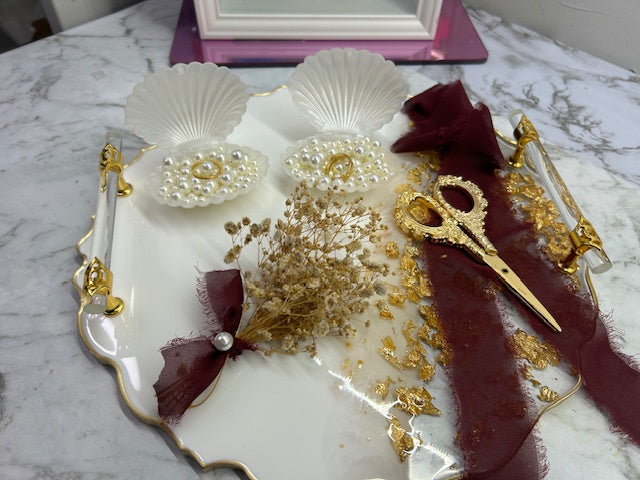 Custom order engagement large tray with white or red roses,bunch of flower,scissors,personaliseribbon.Message through WhatsApp if you like to order now .