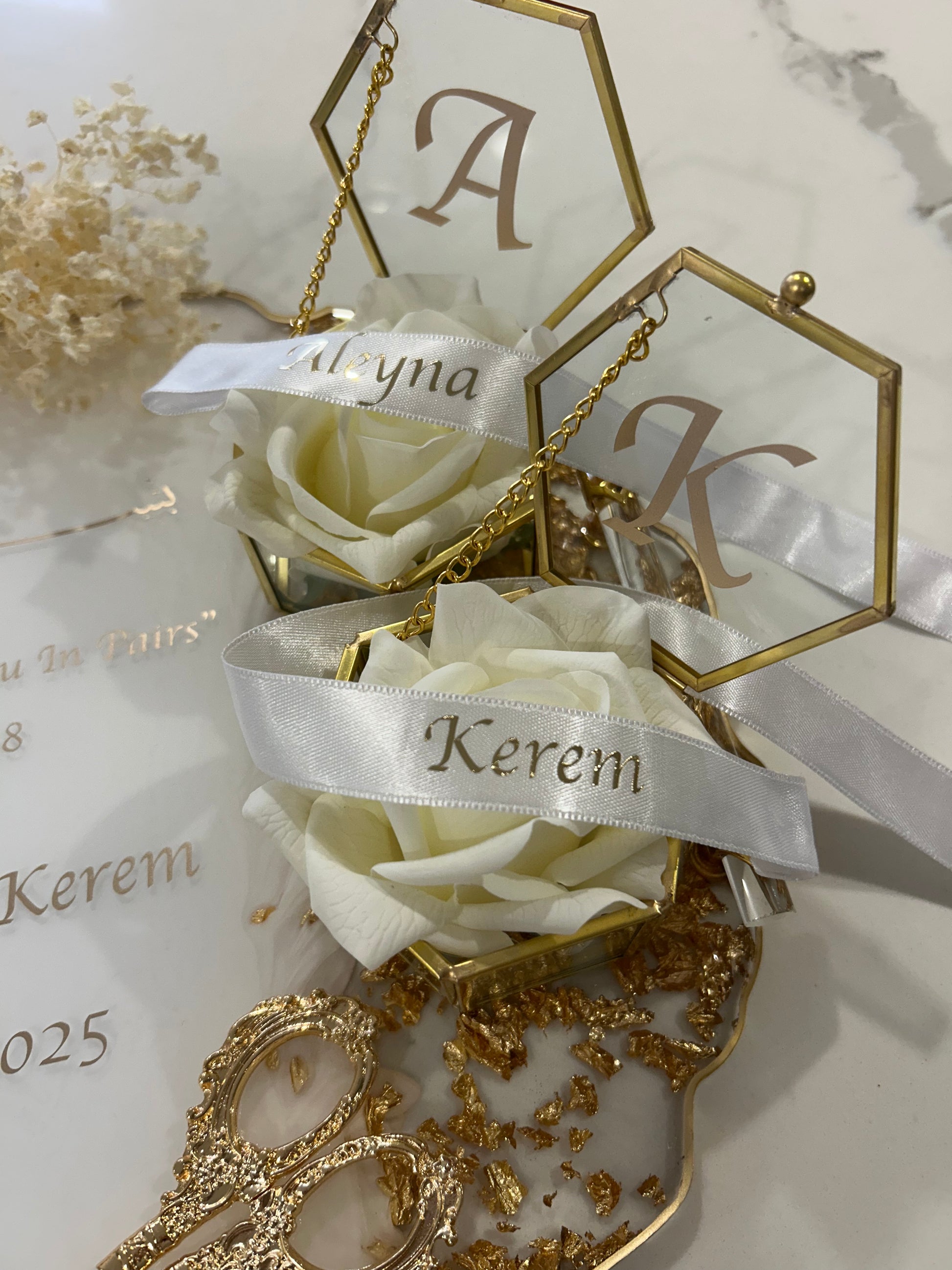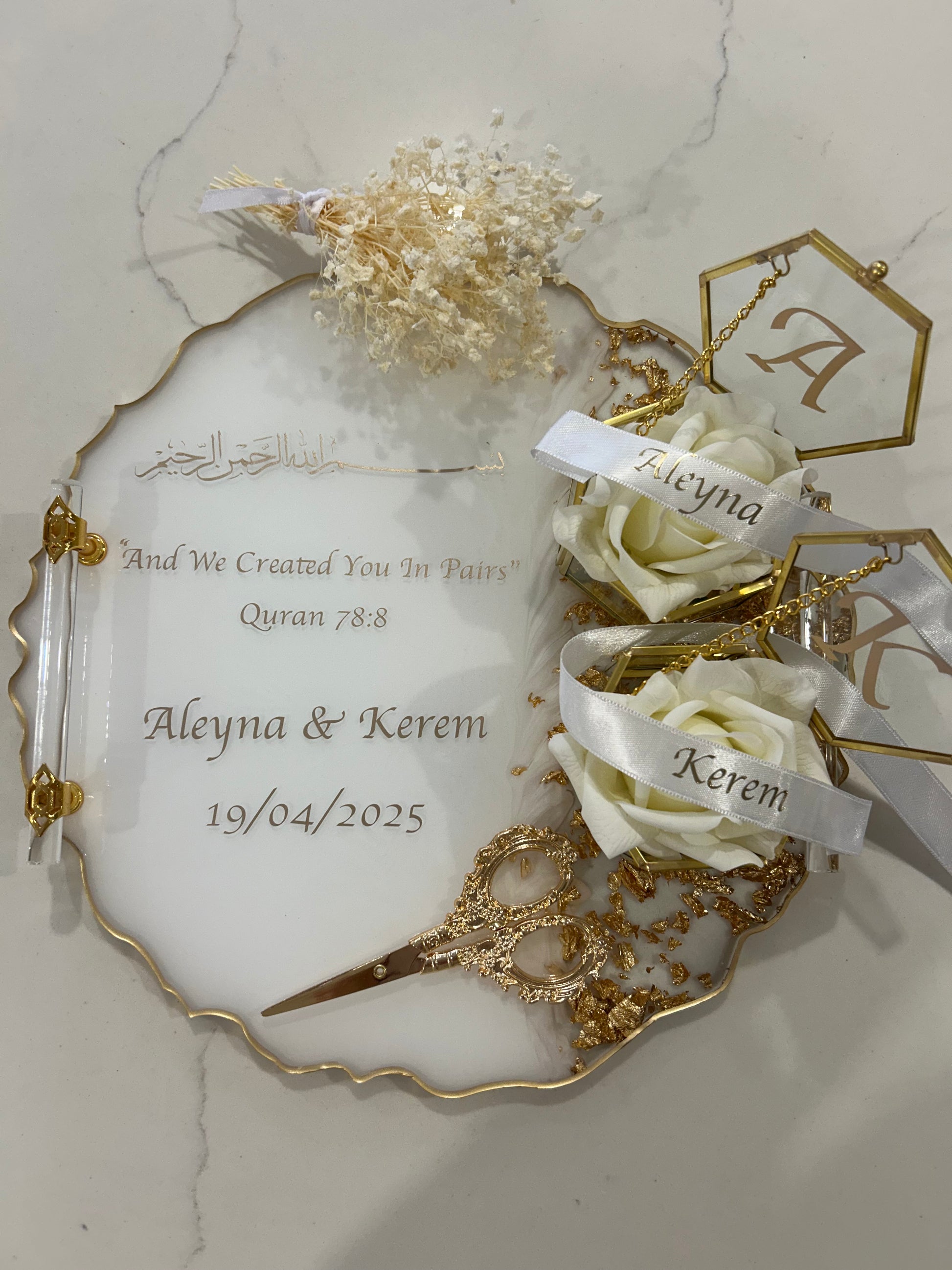 Made thıs beatıful tray for Kerem and Aleyna engagement custom order roses and ınıtıals and decorate wıth white rıbbon and golden scıssors mesage now ıf you lıke to order 0403 731 807