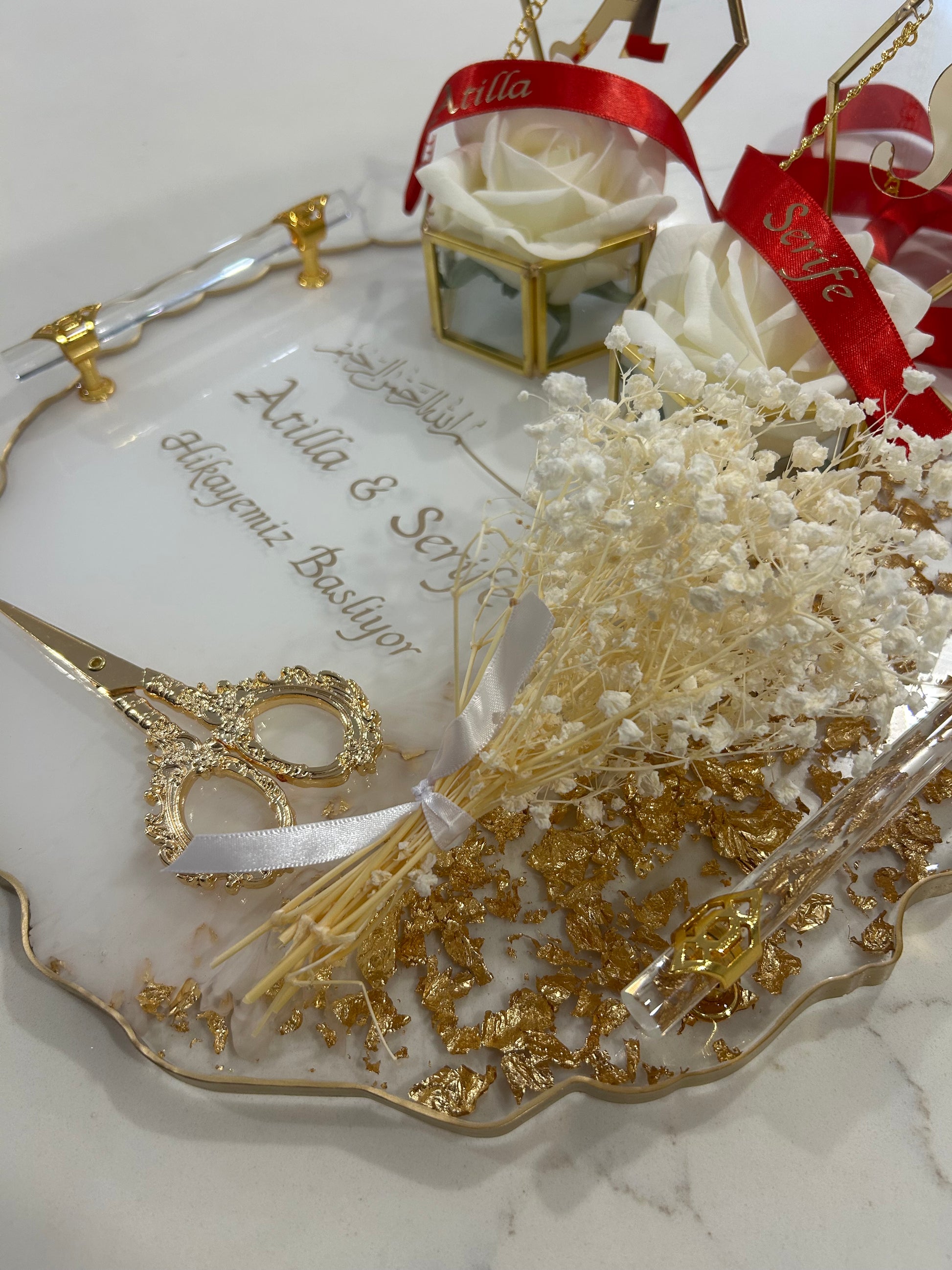 I created this beautiful large engagement tray set using resin, specially made for Atilla and Şerife to celebrate their engagement day. The set features elegant golden scissors and a personalized ribbon, adding a meaningful and luxurious touch to their special moment. Every detail has been carefully designed to make their celebration even more memorable. Message now if you like to order now 0403 731 807