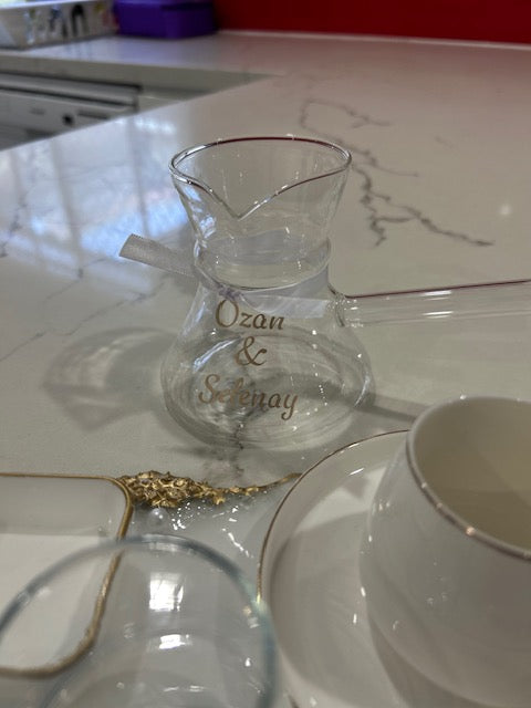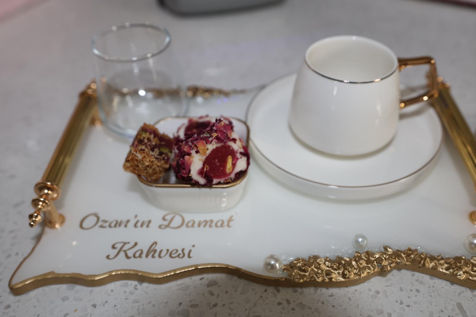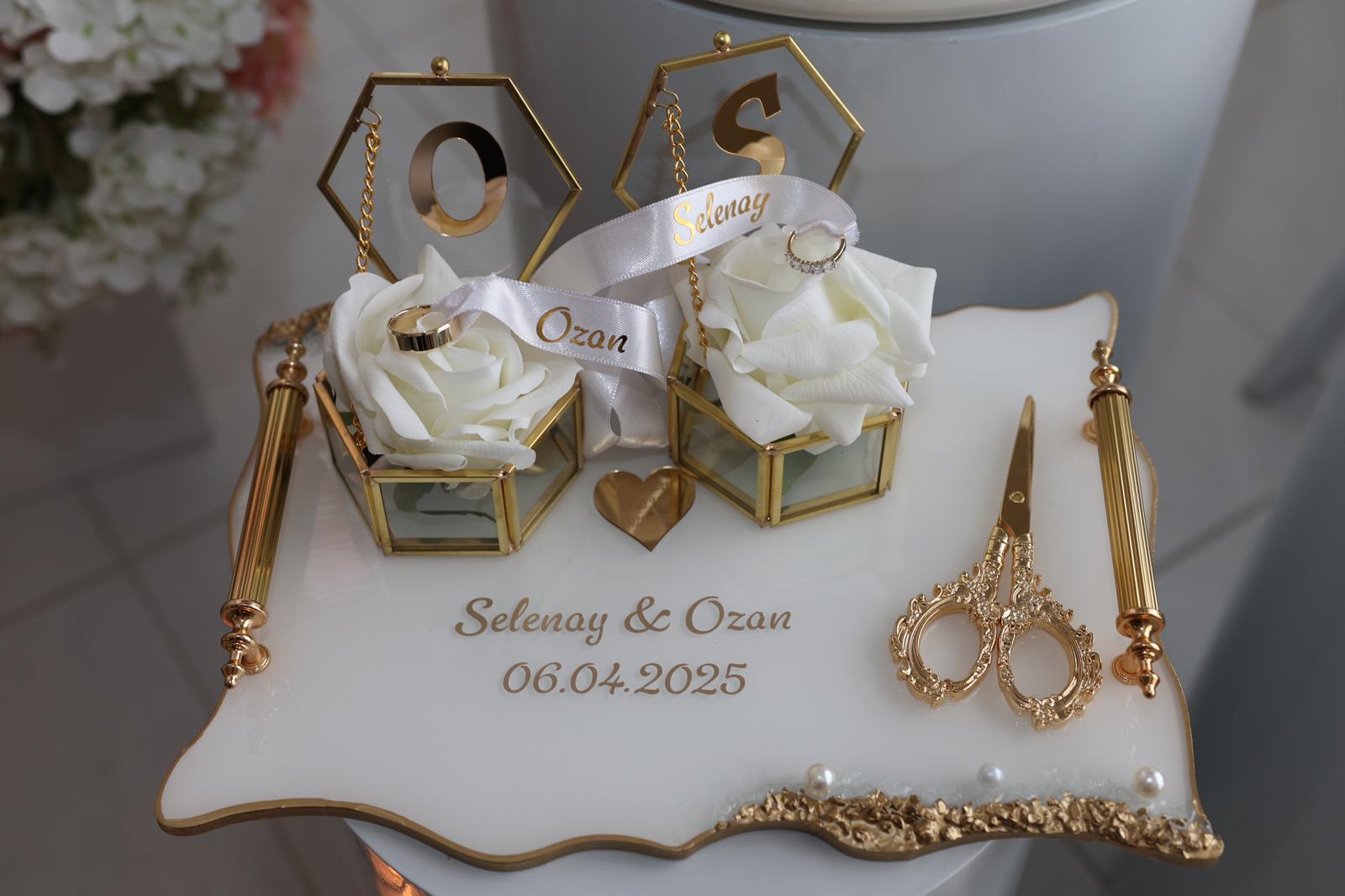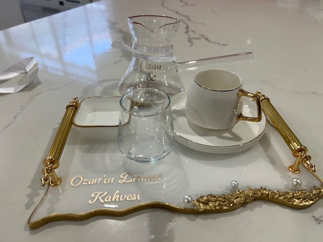 Our engagement bundle is our most popular set here we celebrate Ozan and Selenay engagement with my handmade trays you can see made one tray for damat kahve and another tray for engagement rings in the set include everything you see at the picture two trays,golden scissors,glas boxes ,roses,initials,personalise ribbon,bunch of flower,another tray include cofee cup,glas cup and resin delight bowl you can message now if you like to order yours now .0403 731 807 .