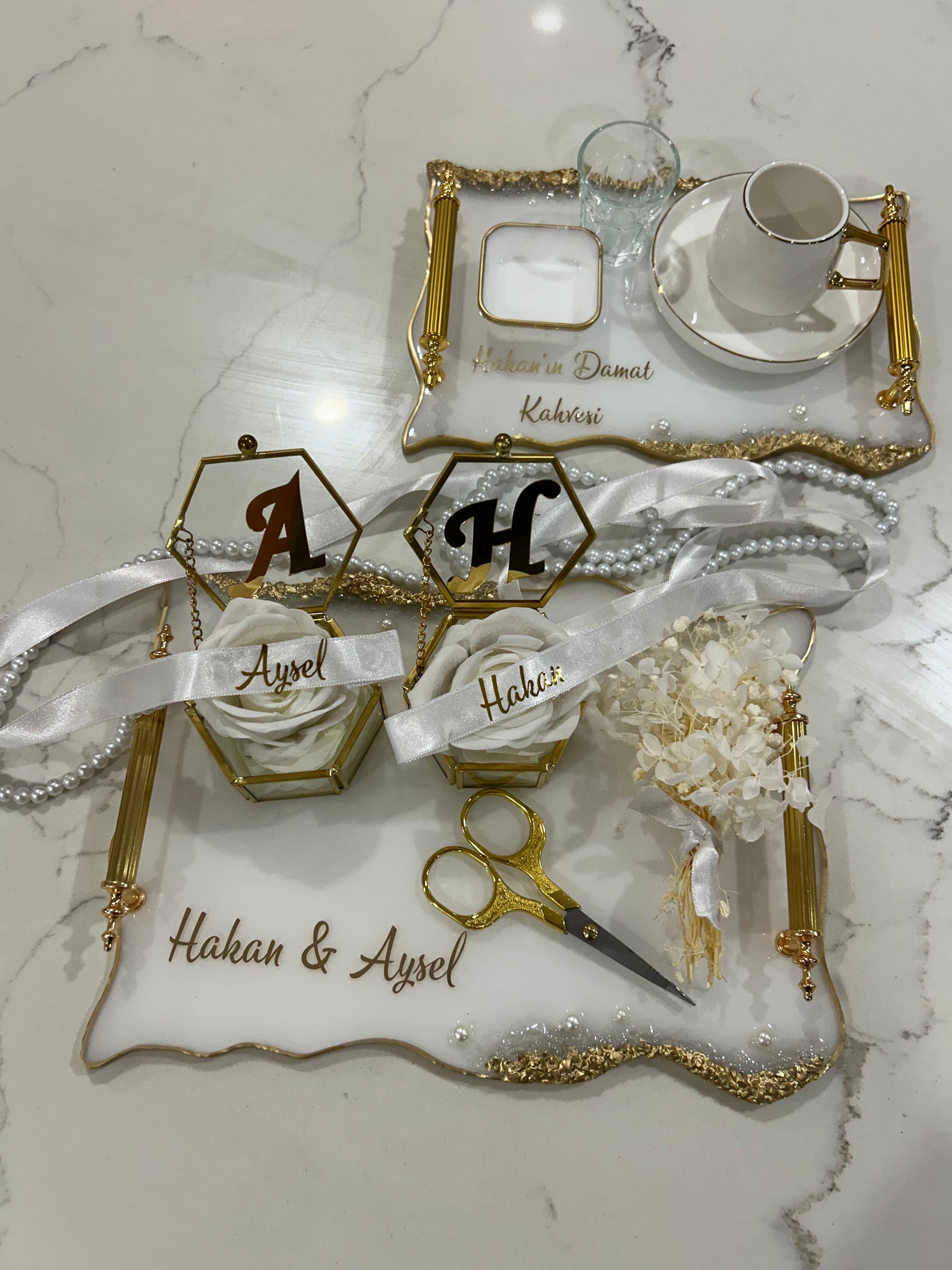 created these two beautiful rectangle trays from resin, designed especially for couples celebrating their engagement. Each tray is carefully handcrafted with love, featuring elegant details that make them perfect for showcasing rings, sweets, or special moments from the ceremony. A timeless keepsake to add a touch of beauty and meaning to their unforgettable day. Message now if you like to order .0403 731 807