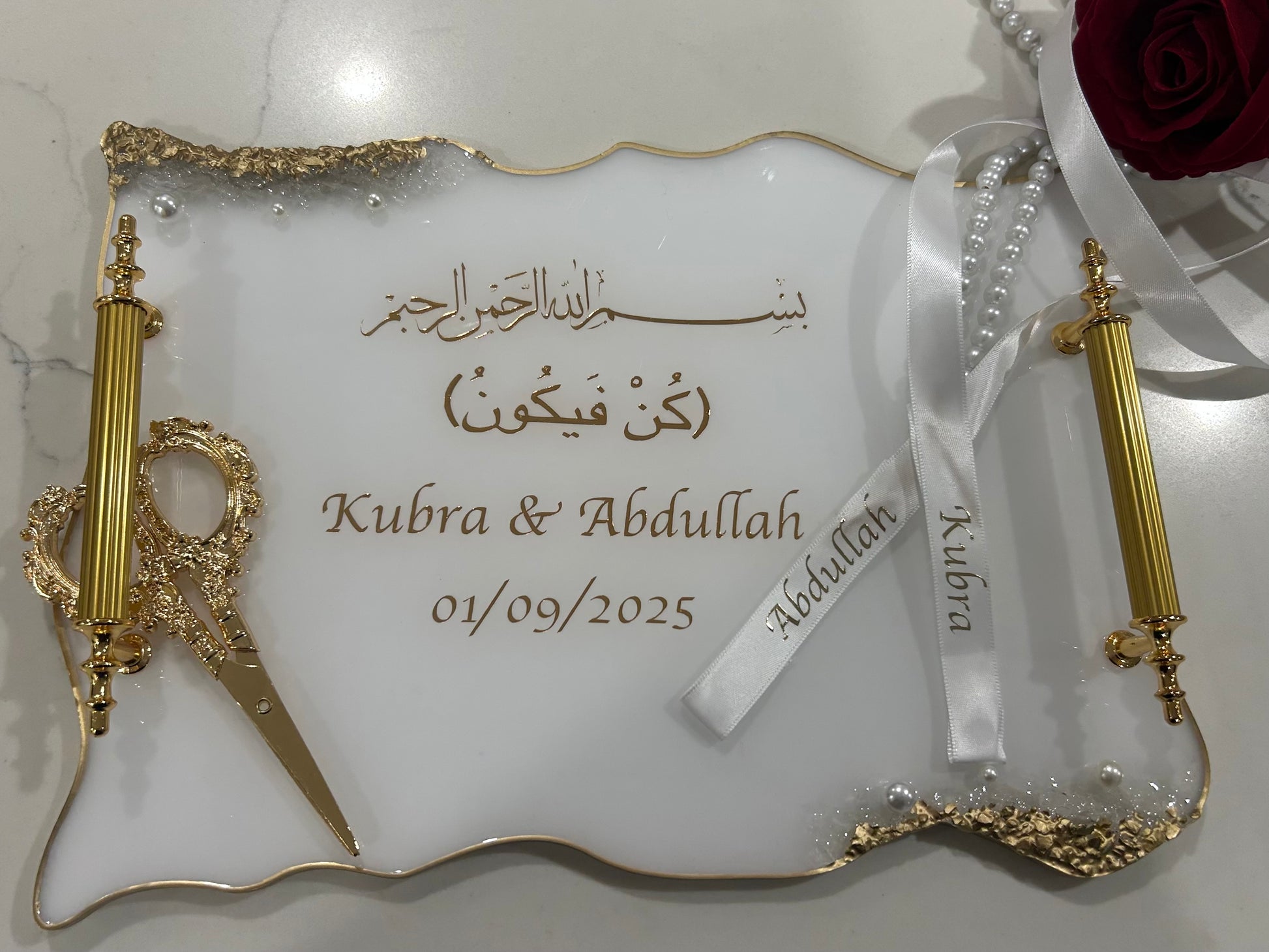 Congratulatıons for Kubra and Abdullah and check our handmade pearl tray personalıse and comes wıth golden scıssors and pearl rıbbon message now ıf you lıke to add thıs beatıful pıece for your event.0403 731 807.
