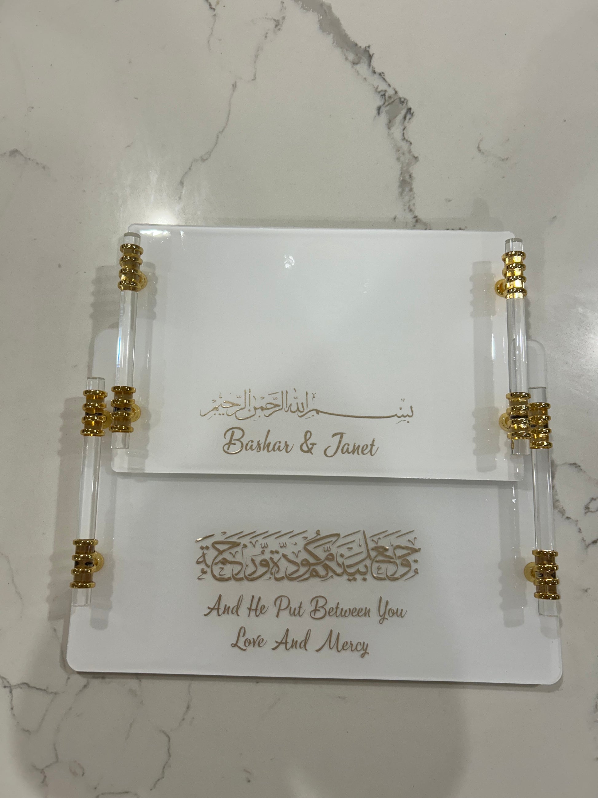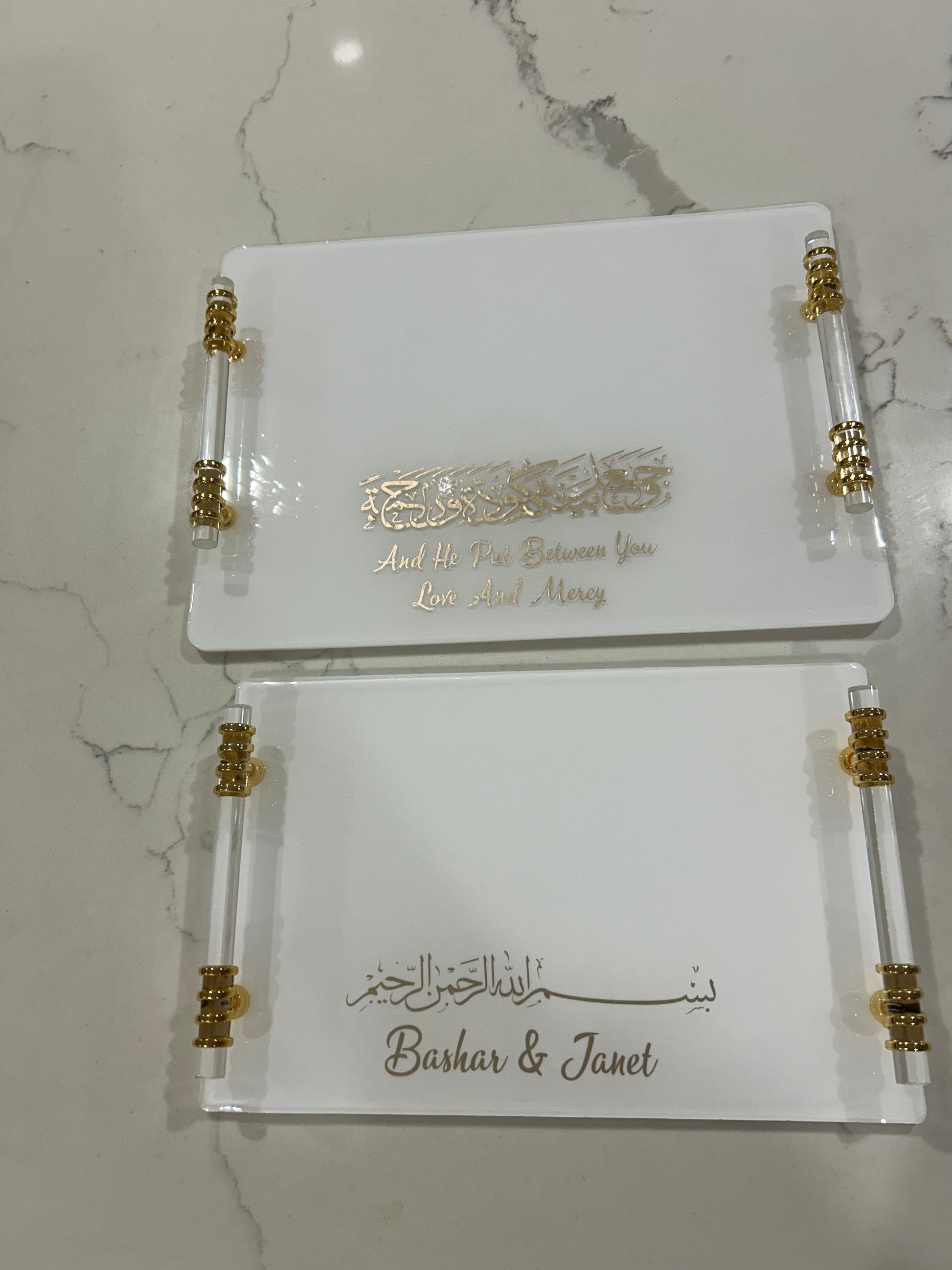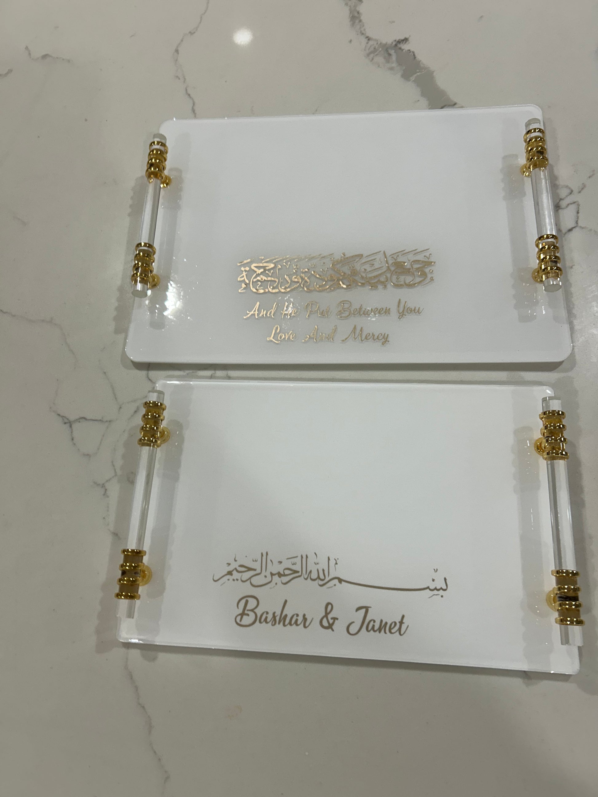 Handcrafted rectangular resin trays, beautifully designed with a clear finish and accented with elegant gold handles. A perfect, luxurious touch for celebrating your special event — ideal for serving, gifting, or showcasing memorable moments. Message now if you like to order 0403 731 807