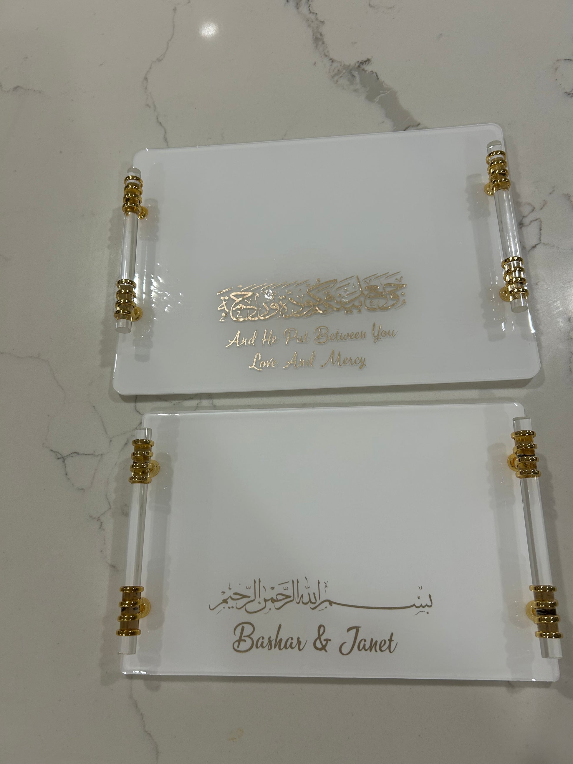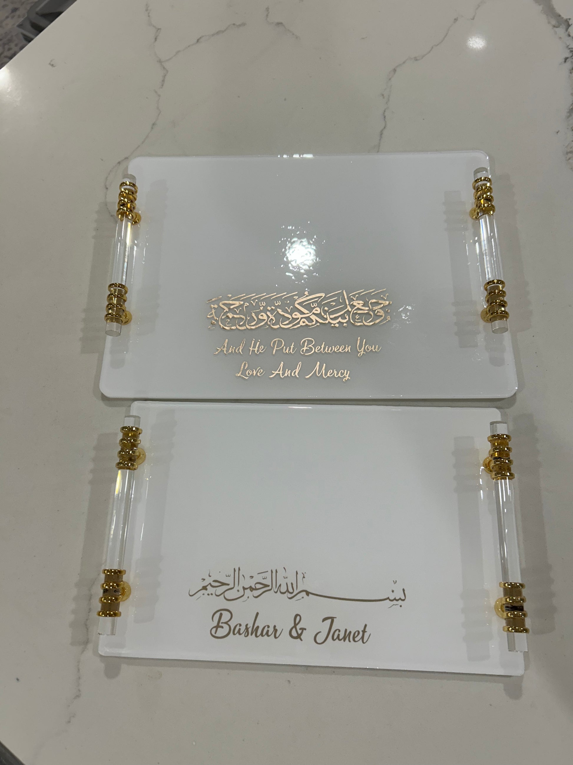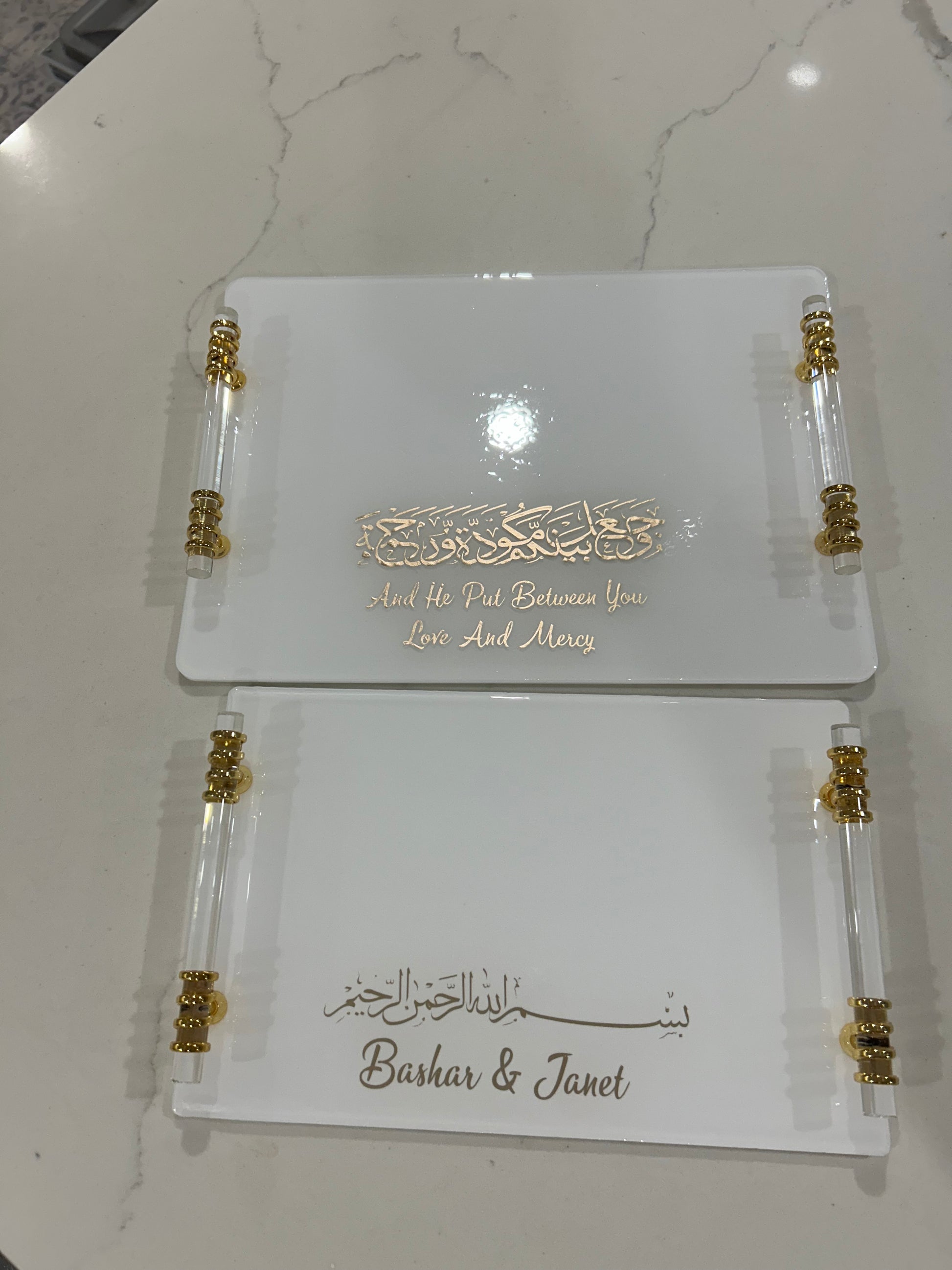Made these beatiful trays for couples while getting engaged and personalise couples names with doa and decorate with clear and gold handles ,Message now if you like to choose your own personalise writing and handles and more.0403 731 807