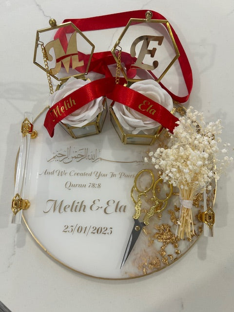 W made this beautiful engagement set including everything you see at the picture. Celebrate your engagement or nikah with this beautiful piece .Its a 28 cm round tray with clear and gold handles comes with personalise ribbon, scissors and roses, glass boxes, bunch of flower and initials at the top of the glass boxes. If yu like to order this beautiful piece message through WhatsApp.