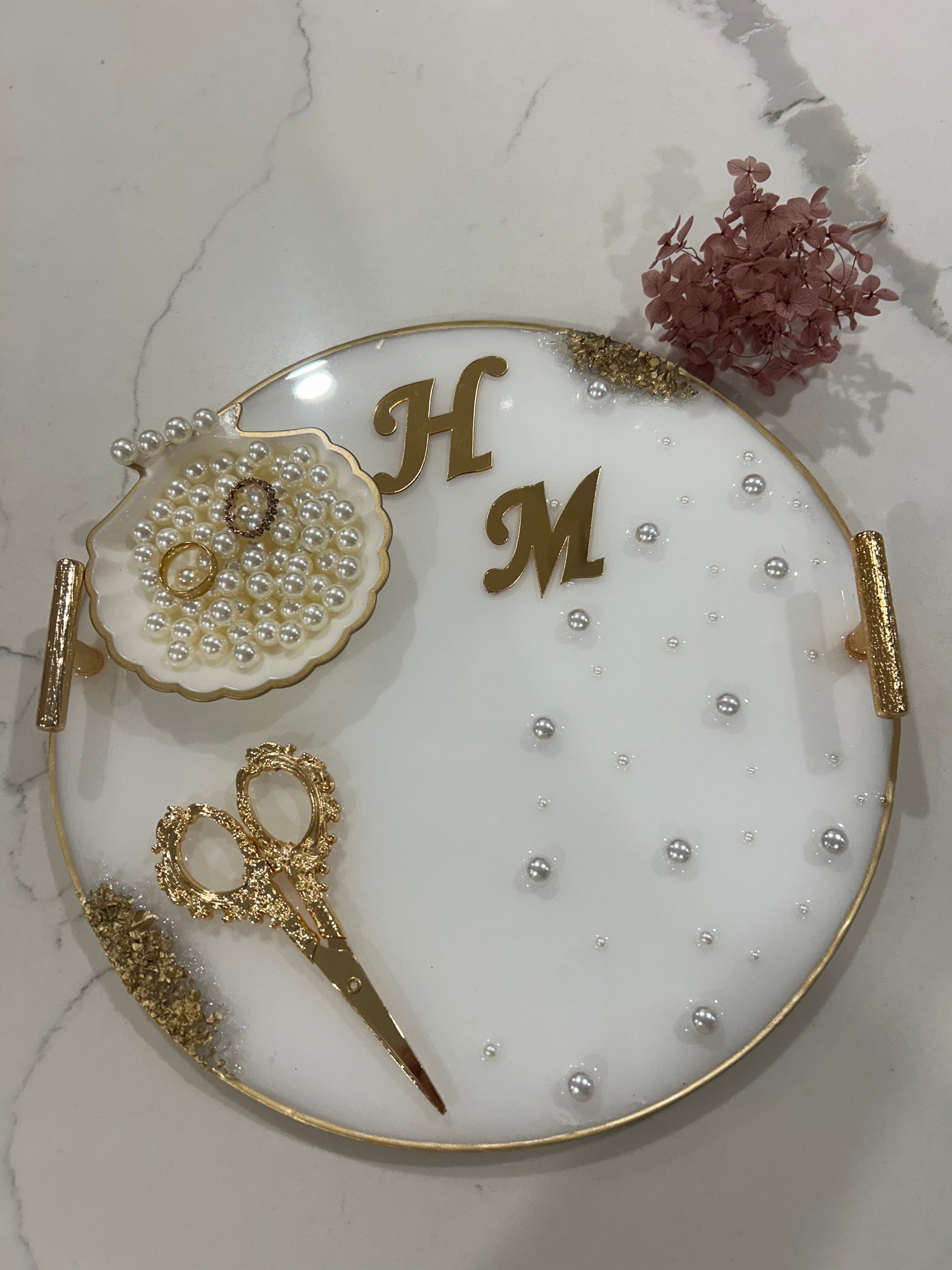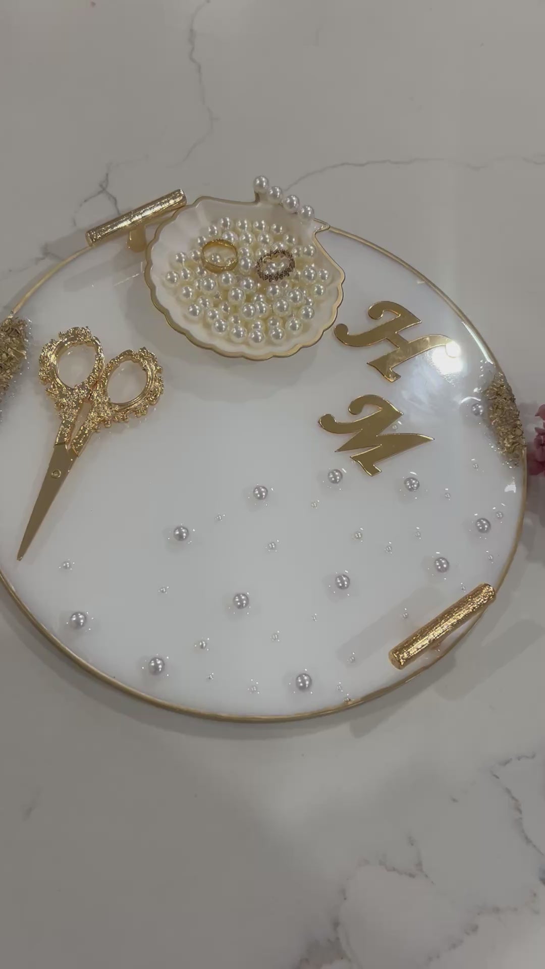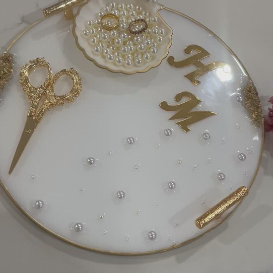This luxurious engagement tray is handcrafted with love and elegance, perfect for a special couple’s celebration. Featuring a glossy white resin base adorned with floating pearls and shimmering gold details, the tray is personalized with golden initials “H” and “M”. It includes a matching pearl ring holder and an ornate gold-toned scissor for the ribbon-cutting ceremony. A delicate touch of preserved pink florals adds natural charm and timeless beauty. Ideal for engagement or henna events, this tray is a symbol of love, elegance, and unforgettable moments. Message now if you like to order 0403 731 807