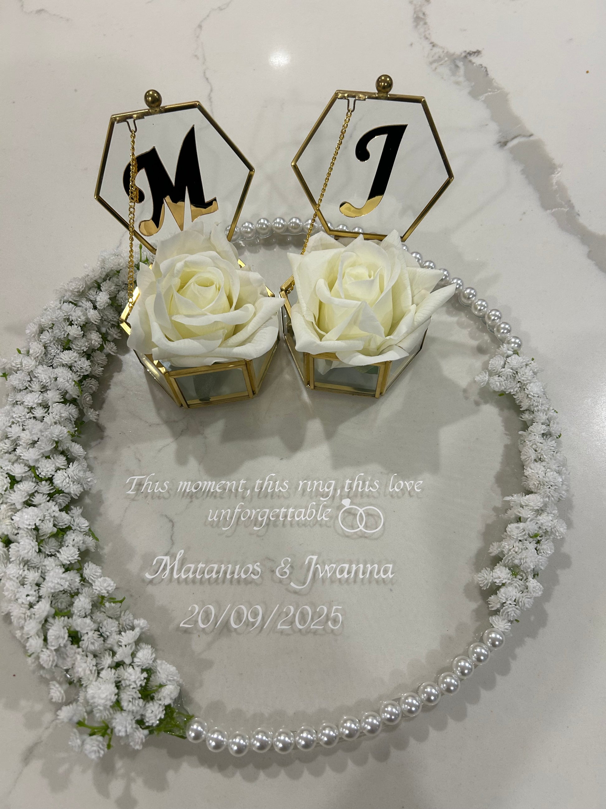 Celebrate love with this handcrafted engagement ring tray, designed with timeless elegance. Featuring delicate white roses enclosed in golden hexagon holders, a circle of baby’s breath flowers, and pearl detailing, this piece beautifully symbolizes purity and everlasting love. The mirrored base is personalized with names, date, and a heartfelt message, making it a meaningful keepsake for your special day.