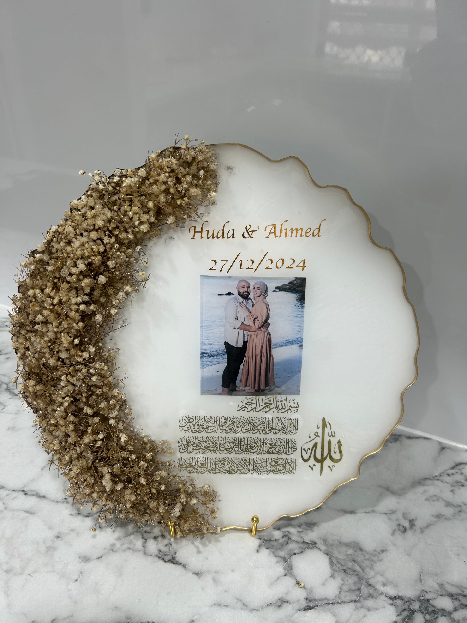 A timeless keepsake handcrafted with the bride and groom’s own wedding baby’s breath, preserved in resin and arranged into a delicate crescent design. Featuring a personalized photo, names, wedding date, and Quranic verses in elegant gold detail, this plate is a meaningful way to treasure precious memories. Perfect as a wedding gift, engagement keepsake, or home display piece.message now if you like to send me your flowers 0403 731 807